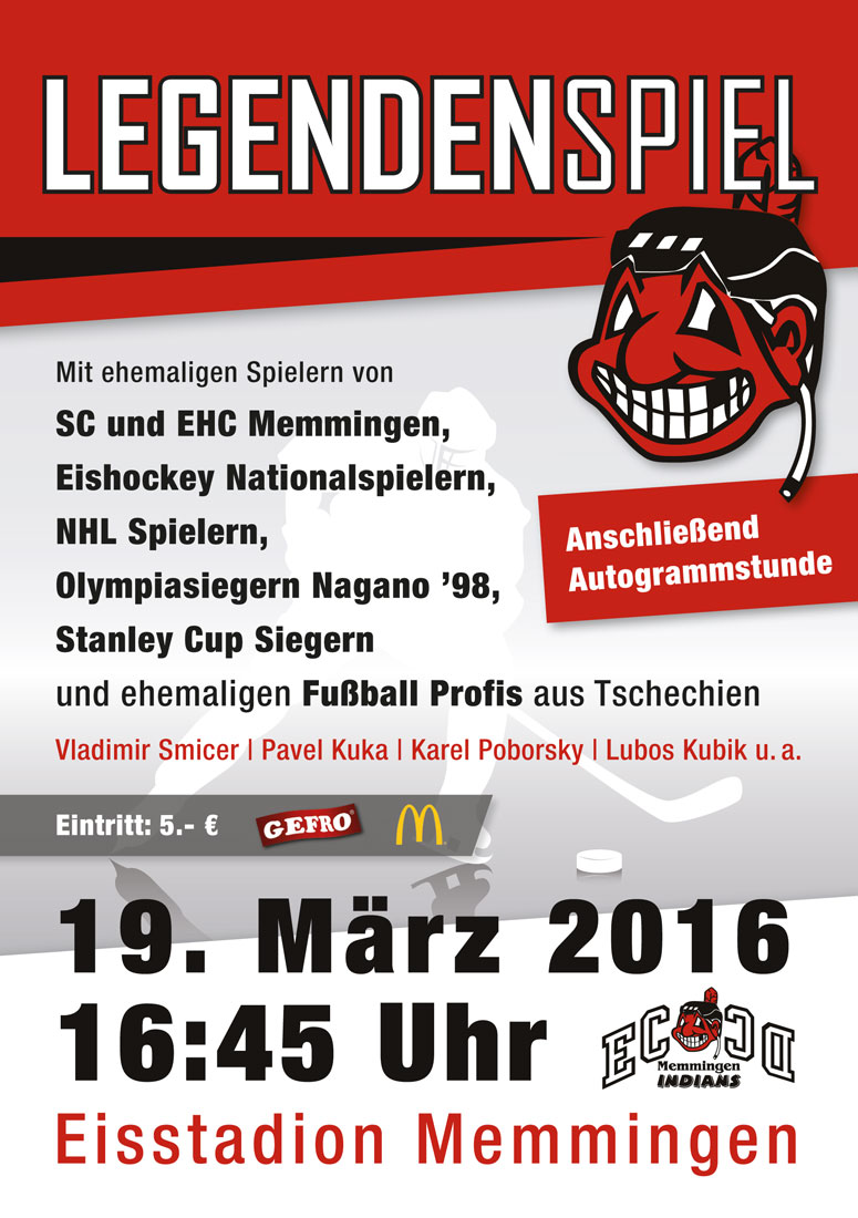 Olympiasieger und Stanley-Cup-Gewinner auf dem Eis am Memminger Hühnerberg – was bis vor kurzem noch undenkbar schien, wird nun dank der Hilfe von ECDC-Kapitän Jan Benda Realität. Am Samstag, 19. März, zur familienfreundlichen Zeit um 16.45 Uhr, gastieren Weltstars des Sports in Memmingen – darunter zahlreiche Vertreter der tschechischen Sportelite. Sie treffen auf eine Legenden-Auswahl aus Deutschland, unter anderem mit den „Hockey Hall of Fame“-Mitgliedern Uli Hiemer und Dieter Medicus. Die Reihen beider Länder-Teams werden jeweils aus prominenten Eishockeyspielern, Fußballern (Europa- und Weltmeisterschafts-Teilnehmer und Champions-League-Sieger) sowie bekannten Vertretern aus Politik und Wirtschaft bestehen. Weitere Namen werden in den kommenden Tagen bekanntgegeben.