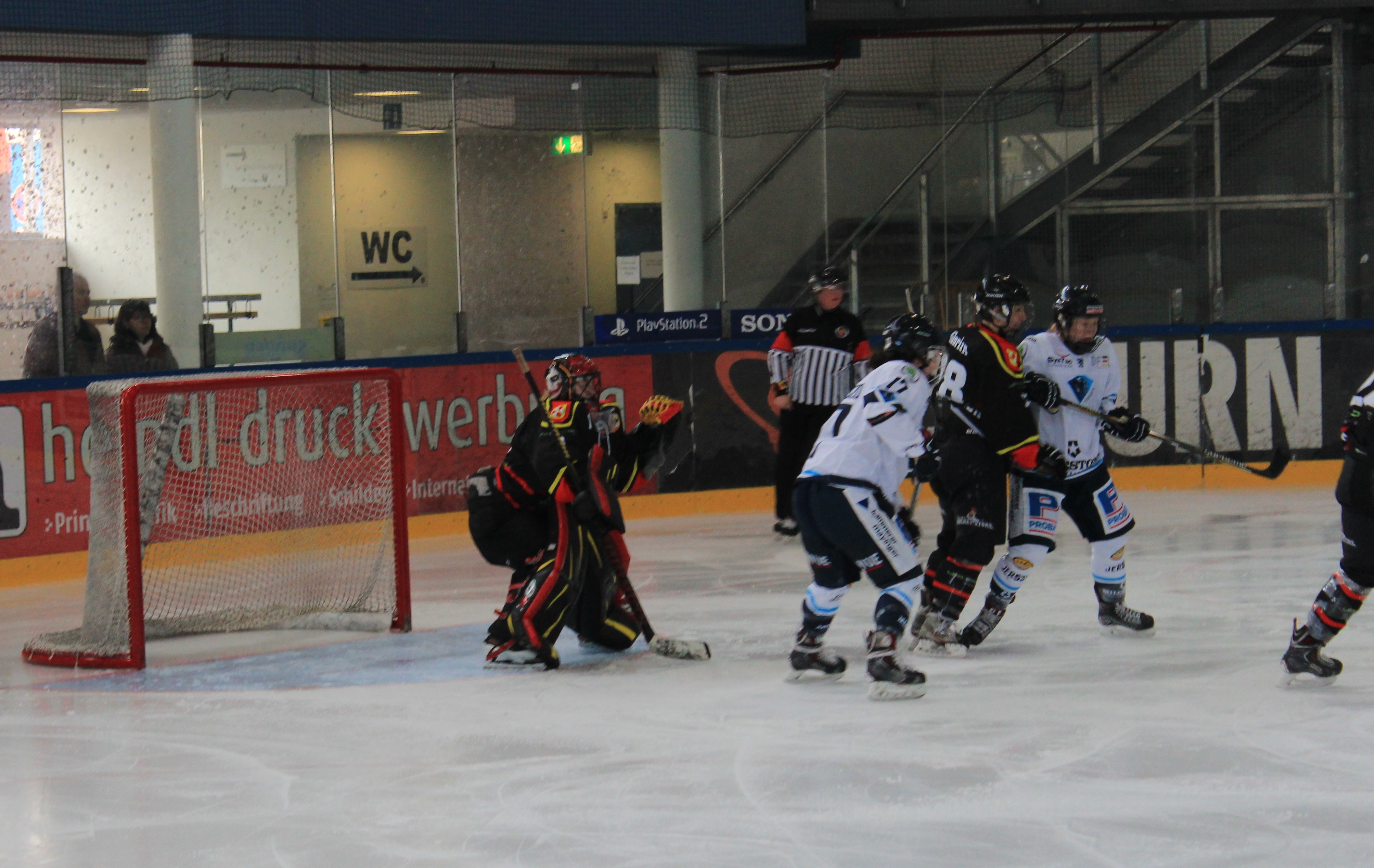 Aber von so etwas lassen sich die Bärinnen nicht beirren. Zu Beginn des zweiten Drittels hatten sie mehr Zugriff auf das Spiel. Das nächste Tor fiel jedoch wieder auf der anderen Seite. Sybille Kretzschmar erzielte kurz nach Wiederbeginn gar das 5:0. Doch nur 2 Minuten später konnte Sabina Florian den ersten Treffer der Bärinnen erzielen. Wiederum eine knappe Minute später wurde Jule Flötgen im Tor des ECB nach einer Parade umgefahren und konnte mit Verdacht auf Gehirnerschütterung nicht weiter spielen. Da der ECB vor dem Turnier keinen zweiten Torhüter nachnominieren durfte und Sarah Körber verletzt nicht spielen konnte, musste sich kurzerhand Claudia Weltermann in die Torwartklamotten schlüpfen. Und sie machte ihre Sache bravourös. Da Flötgen auch noch zwei Minuten für Spielverzögerung bekommen hatte musste Weltermann direkt eine Unterzahlsituation überstehen. Aber auch das steckten die Bärinnen wunderbar weg. Sie kämpften und ackerten um ihrer neuen Torfrau das Leben so leicht wie möglich zu machen und konnten das Spiel weiterhin ausgeglichen gestalten. Nach einem weiteren Tor durch Nina Ziegenhals und zwei weiteren Gegentoren ging es mit einem 2:7-Rückstand in die letzte Pause.