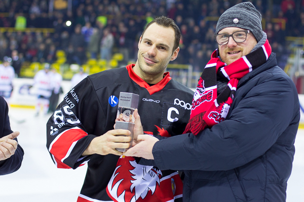 Man muss zwar kein Verfechter des Aberglaubens sein, aber wenn schon der Meisterpokal nicht durch die Hände der Spieler ging, die Rasierer bei den meisten Kufencracks nun im Badezimmerschrank eingeschlossen werden, dann sollten alle wenigstens einmal mit Füchse Maskottchen ‚Manni‘ kuscheln, der beim heutigen Heimspiel mit seinem neuem Plüsch aufwartete und das Eis sowie das Herz der Fans im Rund der Eisarena zum Schmelzen brachte - rechtzeitig zu den PlayOffs und hoffentlich als ein gutes Omen! Aber auch hinter der Bande war eine Menge los. Ein mobiler Stand der DKMS war vor Ort, der informierte und zur Registrierung einlud. Die Mannschaft des EV Duisburg legte bereits vor und viele Zuschauer legten, ganz nach dem Motto ‚Wir besiegen den Blutkrebs!‘, nach - eine schöne Aktion! So haben vielleicht auch einige an Blutkrebs erkrankte noch die Chance die PlayOffs zu erreichen und letzten Endes doch noch als Sieger vom Platz zu gehen. Und wer als Eishockeyfan die DKMS weiter unterstützen möchte, der hat die Möglichkeit eine DEL Goalie-Maske zu ersteigern. Alle Infos dazu gibt es hier.
