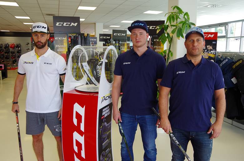(Foto: Wurde nach seiner Verpflichtung gleich bestens eingekleidet: Andreas Farny (Mitte), Links Stefan Spannring von EVL- Ausrüster Create Sports, rechts Michael Messmer, zweiter Vorsitzender EV Lindau Islanders)