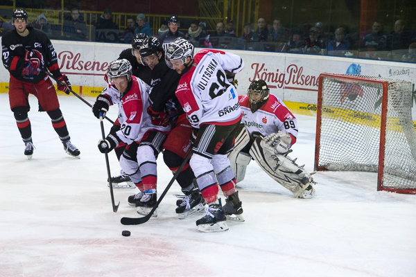 Doch entpuppte sich das feuerspeiende Monster nur als der kleine Drache Grisu, sympathisch und fair, beim Feuer speien allerdings erfolglos. Schlicht und einfach ‚kalt gestellt‘ wurden die Erfurter Eiskratzer. Überraschend ist das Ergebnis von 7:1 (3:1/2:0/2:0) nicht, wirft man einen Blick auf die bisherigen Ergebnisse der Thüringer. Nach einem hart erkämpften Sieg am Altweiberdonnerstag bei den Bären aus Neuwied, lief heute alles wie aus einem Guß und wieder blieb man in der heimischen Arena ungeschlagen. Glücklicherweise verletzte sich Fabio Pfohl im Spiel gegen die Bären nicht schwerwiegend und kam heute wieder zum Einsatz. Joly musste eine Sperre absitzen, dafür war Schmidt nach seinem unnötigen Check in der letzten Woche gegen Niesky wieder mit von von der Partie. Souverän wirkte die Leistung gegen Erfurt, nicht überragend, ab völlig ausreichend gegen schwache Dragons, die lediglich zu einer Bude kamen und dies nach einer Reihe von Unachtsamkeiten in der Abwehr der Füchse. Erfurt dürfte damit endgültig aus dem Rennen um einen der PlayOff Plätze sein und Duisburg muss sich am Freitag im nächsten Heimspiel gegen die Saale Bulls aus Halle beweisen. Verlor man dort doch nach schwacher Leistung das Auftaktspiel der Verzahnungsrunde mit 5:2.