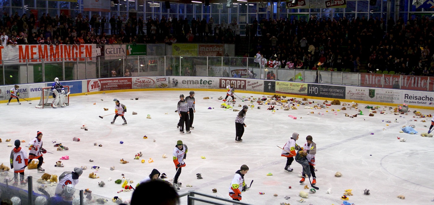 Mit der erstmalig in der Bayerischen Eishockey-Liga durchgeführten Aktion sorgte der ECDC Memmingen im Oktober 2014 für Aufsehen. Exakt 1244 Kuscheltiere kamen auf diese Weise für den guten Zweck zusammen. Und so war es naheliegend, dass das Spektakel nach diesem Erfolg heuer im ersten Heimspiel am Freitag, 9. Oktober, wiederholt wird. „Die Leute kamen auf uns zu und sagten: ‘Das müsst ihr wieder machen‘. Wir hoffen natürlich, dass wir die Zahlen des Vorjahrs wiederholen können und möglichst viele Tiere für notleidende Kinder zusammenbekommen. Fangen Sie also schon mal zu sammeln an“, bittet ECDC-Vorsitzender Helge Pramschüfer die Memminger.