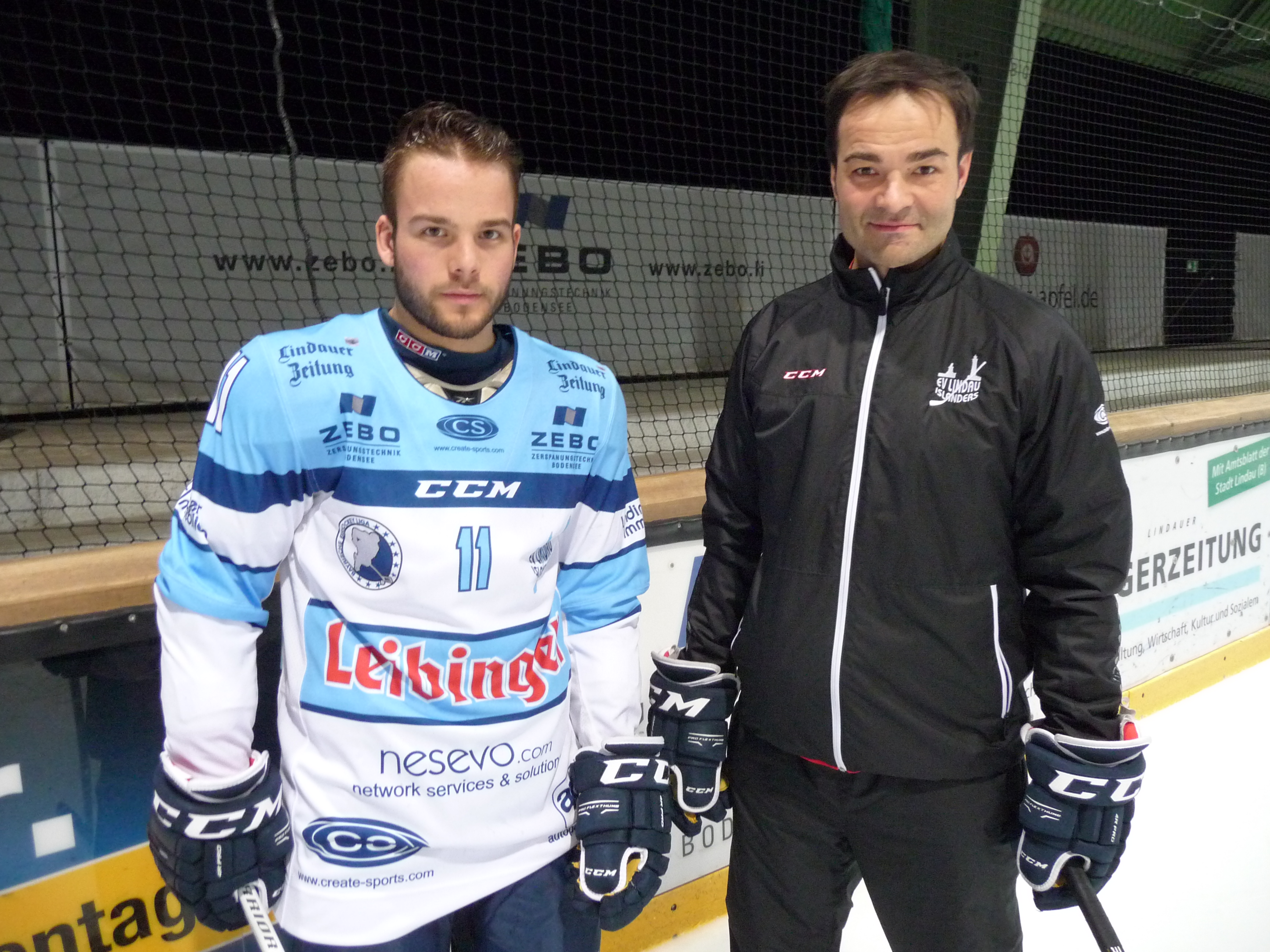( Foto: EV Lindau - Neuzugang Adrian Kirsch (links) mit Trainer Martin Buchwieser(rechts) )