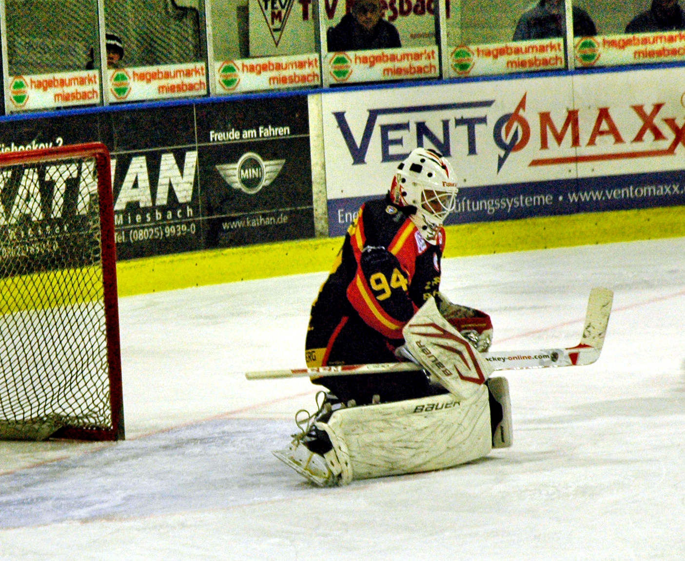 Mit einer Überraschung startete das Sternkopf-Team - im Tor gab Juniorentorhüter Lukas Müller seinen gelungenen Einstand. Ohne Sebastian Buchwieser, ansonsten mit dem kompletten Kader, sowie den Junioren Müller, Birkner und Hörndl begann ein flottes Bayernligaspiel. Lukas Müller mußte gleich zu Beginn des Spiels zeigen, warum er eingesetzt wurde. Mit ein wenig Glück und Können parierte er die ersten Angriffsversuche der Gastgeber. Auch die Gäste von der Ammer verzeichneten ihrerseits Chancen, um in Führung zu gehen. Eine erste Duftmarke setzte Valentin Hörndl, der in der 7. Minute die Führung auf dem Schläger hatte. Den Querpass wollte er direkt verwandeln, doch Torhüter Danijel Kovacic hatte etwas dagegen. In der 11. Minute wieder ein schneller Konter der Peißenberger, doch auch Martin Hinterstocker scheiterte am Miesbacher Torhüter. Nach einigen Chancen der Miesbacher dann die umjubelte 1:0-Führung der Heimmannschaft. Die Scheibe lief über Kirschbauer und Barz zum Torschützen Pier-Oliver Cotnoir, der frei vor Lukas Müller zum Schuß kam. Kurz darauf hatte Moritz Birkner den bis dahin verdienten Ausgleich auf dem Schläger, leider agierte er zu nervös und konnte die Scheibe aus spitzem WInkel nicht im leeren Tor der Miesbacher unterbringen.