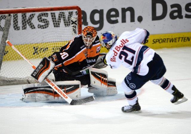 Vor 2.256 Zuschauern ging Wolfsburg im zweiten Spielabschnitt mit 2:0 in Führung. Doch im dritten Drittel glichen die Red Bulls durch das erste Saisontor von Dominik Kahun und den ersten DEL-Treffer von Maximilian Kastner aus. Nach der torlosen Verlängerung hielt EHC-Goalie Danny aus den Birken im Penaltyschießen alle drei Wolfsburger Versuche. Jason Jaffray verwandelte seinen Penalty und krönte damit die Aufholjagd.