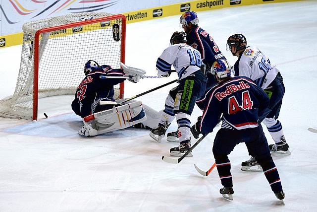 Die Red Bulls erwischten den besseren Start in der Partie und brauchten nur rund 136 Sekunden bis sie zum ersten Mal zuschlugen. Martin Hinterstocker musste in der dritten Spielminute nur noch einschieben, nachdem er mustergültig von Felix Petermann bedient wurde. Vom frühen Gegentreffer ließen sich die Gäste aus Niederbayern jedoch nicht beirren und hatten schnell eine Antwort parat. Straubings Topscorer Blaine Down netzte nur wenig später glücklich zum 1:1 ein (5.). Auch nach den beiden frühen Treffern war es eine Flotte Partie mit guten Torchancen auf beiden Seiten. In einem hart umkämpften ersten Spielabschnitt wollte jedoch kein weiterer Treffer mehr fallen.