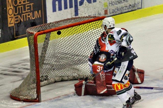 Die Scheibe sprang nach einem traumhaften „Lupfer“ aus dem Landshuter Tornetz zurück und die Partie wurde ohne Pfiff fortgesetzt.