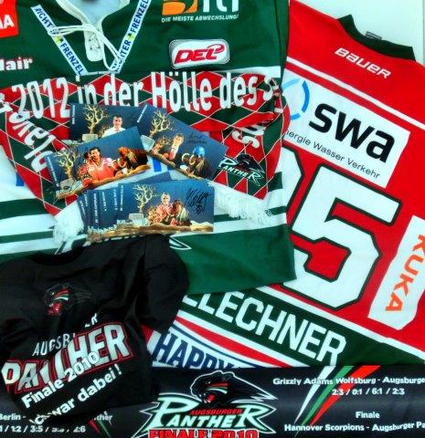 Im Fanpaket der Augsburger Panther ist ein Original Gameworn Trikot von Patrick Ehelechner, ein Gameissued (Ersatztrikot) #31, ein kompletter Satz Autogrammkarten & Schal, sowie ein Fan T-Shirt & Schal "Finale 2010 wir waren dabei" enthalten.
