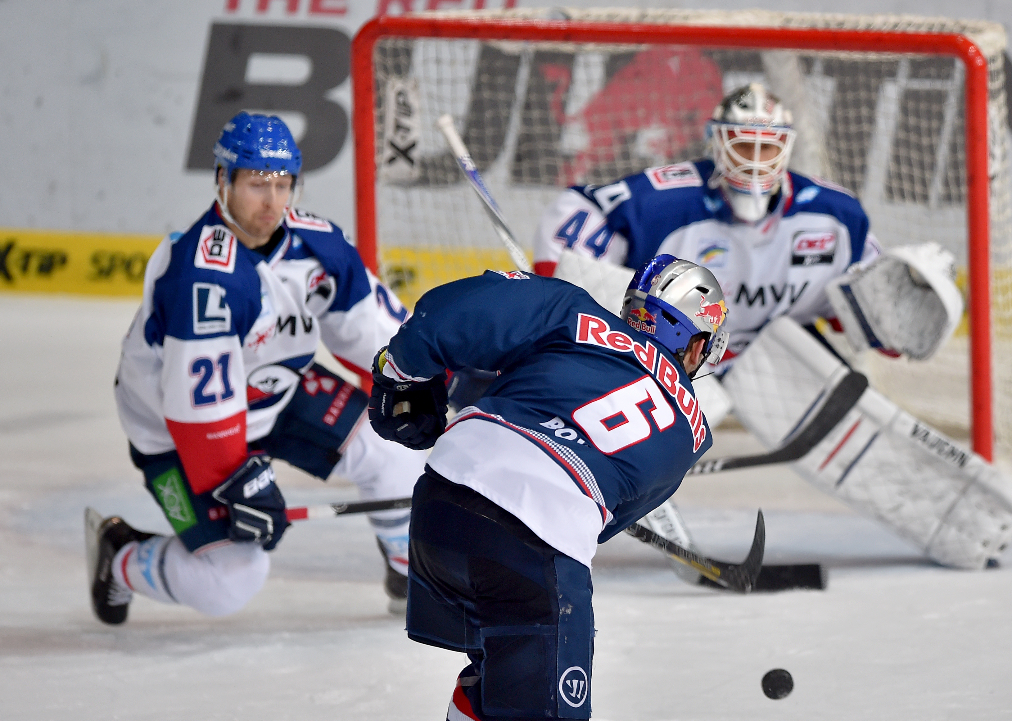 Es war von Beginn an zu spüren, dass viel auf dem Spiel stand: Die Zweikampfintensität war hoch, um jede Scheibe wurde gekämpft. In Überzahl versuchten die Mannheimer gleich zweimal, Niklas Treutle im kurzen Eck zu überwinden, doch der Münchner Goalie konnte beide Versuche mit der Maske parieren (2. und 3.). Die erste Möglichkeit für die Red Bulls hatte Garrett Roe, der mit seinem Schuss von halbrechts knapp am langen Pfosten vorbei zielte (6.). Dann kassierten die Adler ihre erste Strafe. Da eine Zeigerumdrehung später erneut ein Mannheimer in die Kühlbox musste, waren die Red Bulls eine Minute lang mit 5-gegen-3 in Überzahl.