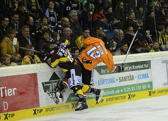 Es ging jetzt hoch und runter und beide Torhüter rückten mehr und mehr in den Blickpunkt. Beide Teams suchten die schnelle Entscheidung. Beide Keeper aber konnten zunächst einen Einschlag verhindern. In der 74. Minute war es dann Müller, der sich die Scheibe eroberte und allein auf Brückmann zuging. Dieser aber wehrte seinen Versuch ab. Der Krefelder Stürmer eroberte den Puck zurück und zog erneut ab, doch wieder konnte Wolfsburgs Schlussmann parieren. Doch auch die Gastgeber hatten ihre Gelegenheiten, so wie bei einem 3 auf 2 in der 77., oder Likens, der in der 78. an Duba scheiterte. Das folgende Bully gewannen die Wolfsburger und Likens zog von der blauen Linie ab und die Scheibe schlug, von Scofield unhaltbar für Duba abgefälscht, zur Entscheidung ein.