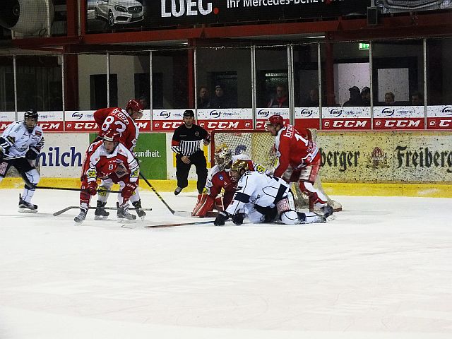 Schon zu Beginn des 1. Abschnitts wurde auf dem Eis sichtbar, dass die Gäste aus Dresden die technisch bessere Mannschaft auf dem Eis sind. Sie waren immer einen Schritt schneller und kontrollierten die Scheibe. Bei den Rot/Weißen sah es eher nach Zufall aus und so kam auch kein richtiger Spielaufbau zu Stande. Die Strafzeit in der 5. Spielminuten saß der Weiß/Blaue ab und sein Team auf dem eis hatte dabei nicht allzu große Chancen der Hausherren abzuwehren. Wie man ein Powerplay spielt, zeigten dann die Dresdner. In der 8. Minute musste Andrè Schietzold in die Kühlbox und es dauerte keine 60 Sekunden um den Treffer zu erzielen. Die Eislöwen verstanden es die Scheibe gut laufen zu lassen und spielten so ihren Torschützen frei. Auch in der Folgezeit bleiben die Gäste das spielstärkere Team, doch die Eispiraten setzten immer wieder Konter, kamen aber nur selten gefährlich ins Drittel der Dresdner. Ehe es in die Kabine ging, gab es Aufregung, denn Die Reihe um Daniel Bucheli fuhren einen Konter und schlossen diesen ab. Die Reihe feierte das Tor, doch das Spiel lief weiter. Der Schiedsrichter hatte auf „kein Tor“ entschieden und auf einmal jubelten die Blau/Weißen. Jetzt war das Chaos perfekt, doch nach einer Beratung und dem Austausch der Ansichten wurde der Ausgleich (16.) gegeben und die Uhr zurück gestellt. Somit ging es mit dem 1:1 in die Pause.