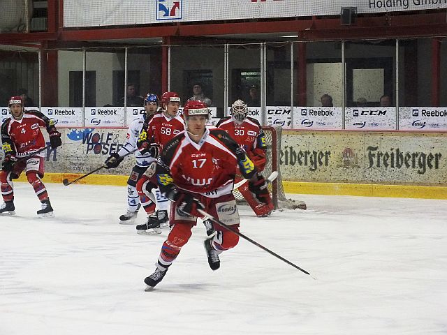 Florian Kirschbauer musste in dem Spiel viel einstecken. Das führte im 1. Abschnitt schon dazu, dass er mit einer blutenden Wunde am rechten Auge kurzzeitig vom Eis musste. Nach dem diese Wunde mit 4 Stichen genäht war, konzentrierte er sich wieder auf das Spiel und ging auch weiterhin in die Zweikämpfe. Kassel nutzte die schwache Anfangsphase der Hausherren um das Spiel zu drehen. Bis zur 30. Spielminute erzielten Sie 3 Tore und gingen damit in Führung. Erst danach schienen die Rot/Weißen wieder richtig auf dem Eis zu sein und glichen postwendend aus (31.). Der offene Schlagabtausch hatte nun richtig Fahrt aufgenommen und die Teams zeigten eine Partie auf Augenhöhe. Crimmitschau konnte in der 32. Spielminute wieder in Führung gehen, doch lange halten konnten Sie diese nicht. Kassel hatte nun richtig gut ins Spiel gefunden und sah seine Chance Platz 2 weiter abzusichern. So war es auch wenig überraschend das noch vor der Pause der Ausgleich gelang. Nach der Pause sollte es also wieder bei 0 losgehen und beide Teams hatten die Möglichkeit den Sieg zu holen.