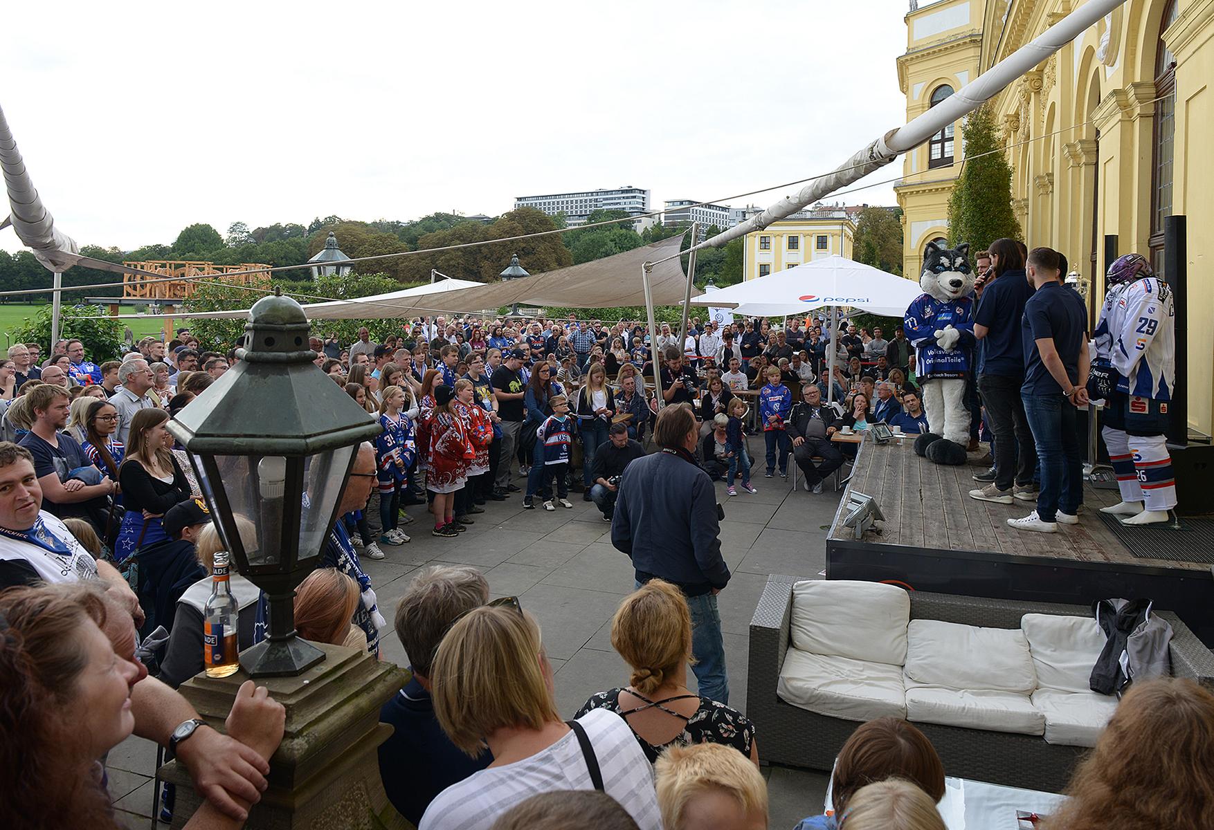 (DEL2/Kassel) PM Die Kassel Huskies haben vor der Orangerie am Sonntagnachmittag die neue Saison eröffnet. Vor zahlreichen Fans und Sponsoren, darunter auch Sylke Klapp und Malte Harbusch von Hauptsponsor Volkswagen, präsentierte sich die Mannschaft für die neue Spielzeit.