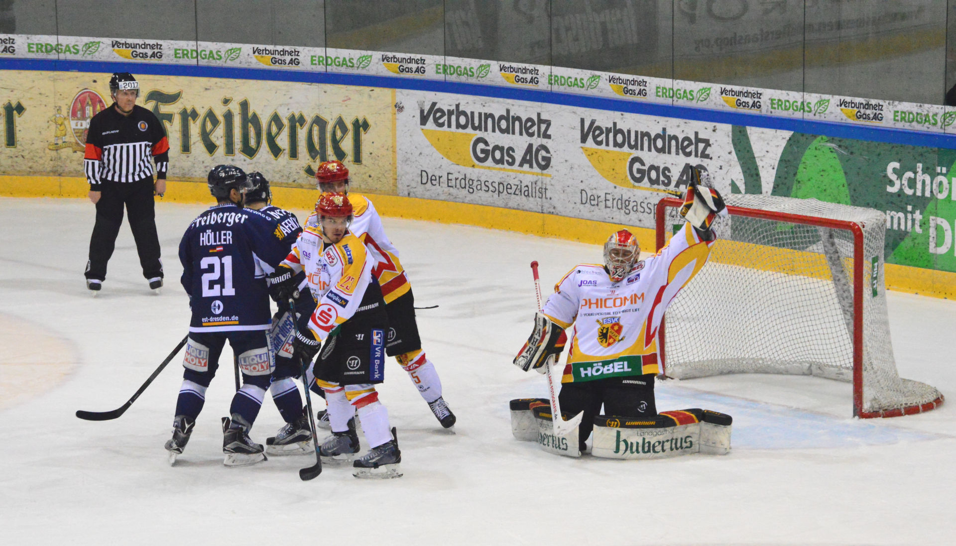 Beide Teams verbuchten in der Anfangsphase je eine Großchance. Nach fünf Minuten scheiterte Jens Meilleur aus zentraler Position an Eispiraten-Torhüter Ryan Nie, keine Minute später traf Jason Pinizzotto bei seinem Versuch nur die Latte. Besser machte es Manuel Klinge nach knapp sieben Minuten, indem er den Abpraller nach einem Merl-Schlenzer zum 1:0 verwertete. Gut zwei Minuten später hätte Jens Meilleur per Konter erhöhen können, jedoch blieb sein Schuss im Gewühl vor dem Crimmitschauer Gehäuse hängen.