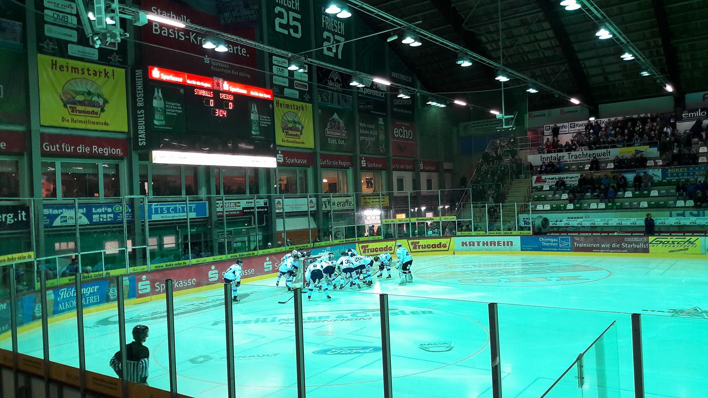 Die Partie begann aus Sicht der Hausherren denkbar schlecht, denn die Gäste gingen nach etwas mehr als zwei Spielminuten völlig überraschend und auf kuriose Arte und Weise in Führung. André Mücke schlenzte die Scheibe von der Bande auf Höhe der Mittellinie aus der Verlegenheit in Richtung Rosenheimer Tor, wo sich Keeper Timo Herden das vor ihm aufhüpfende Spielgerät unbedrängt ins eigene Netz schaufelte – 0:1 (3.). Doch seine Vorderleute zeigten sich nicht geschockt. Tyler Scofields Abschluss wenige Sekunden danach, den Gästetorwart Konstantin Kessler mit einer tollen Parade entschärfte, war ein erster Warnschuss dem weitere Chancen folgten. Tyler McNeely setzte einen abgefälschten Schlenzer von Cameron Burt aus der Luft nur knapp am Pfosten vorbei (6.), und nach einem schönen Spielzug mit Abschluss von Manuel Edfelder verfehlte die Scheibe das Gästetor ebenfalls nur knapp – Kessler hatte sie noch minimal, aber effektiv ablenken können (7.). Eine Minute später war der Gästekeeper zwar gegen den nach Sahnepass von Maximilian Vollmayer alleine vor ihm abschließenden Tyler McNeely ebenfalls noch an der Scheibe, konnte den verdienten Ausgleichstreffer aber nicht verhindern. Das 1:1 geht als Überzahltreffer in die Statistik ein, denn die Gastgeber hatten sich nach einer Phase mit vier Feldspielern auf beiden Seiten gerade wieder komplettiert (9.).