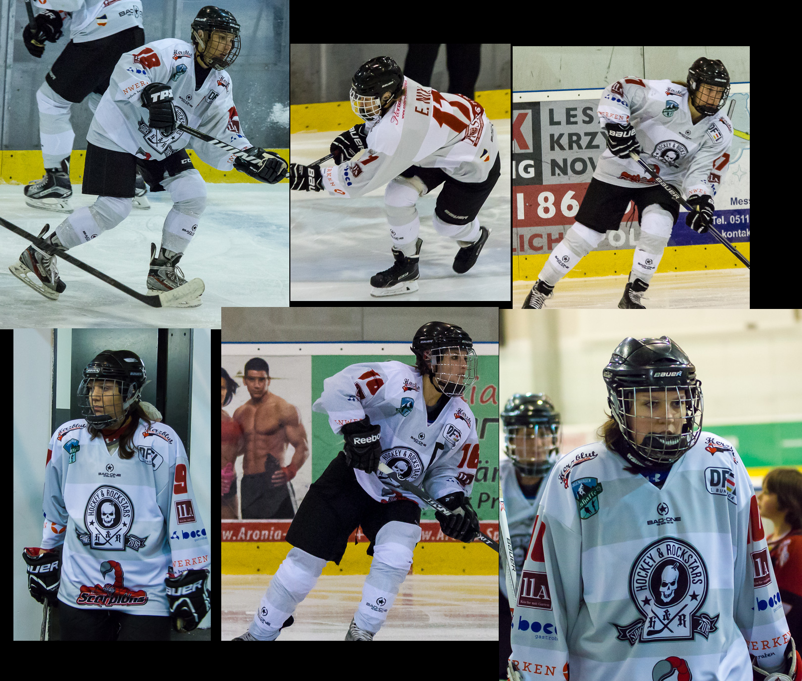 Jasmin: „Ich habe überwiegend bei den Jungs gespielt. In Braunschweig im Nachwuchs unter den "kleinen Löwen" angefangen, weiter ging es im Schüler/Jugend/Junioren Bereich bei den Hannover Seahawks, EHC Wolfsburg und der Jugendbundesliga bei den Indians. Als ich 13 Jahre alt war, konnte ich bereits erste Erfahrungen in Hannover im Dameneishockey sammeln. Damals war die Bundesliga noch in Nord und Süd aufgeteilt. Später ging es dann bei den Eisladies vom OSC Berlin, EC Bergkamen und dann hier bei den Lady Scorpions (früher Lady Jets) weiter, wo ich auch bei den Herren des Vereins (Langenhagen Jets) spielen konnte. “