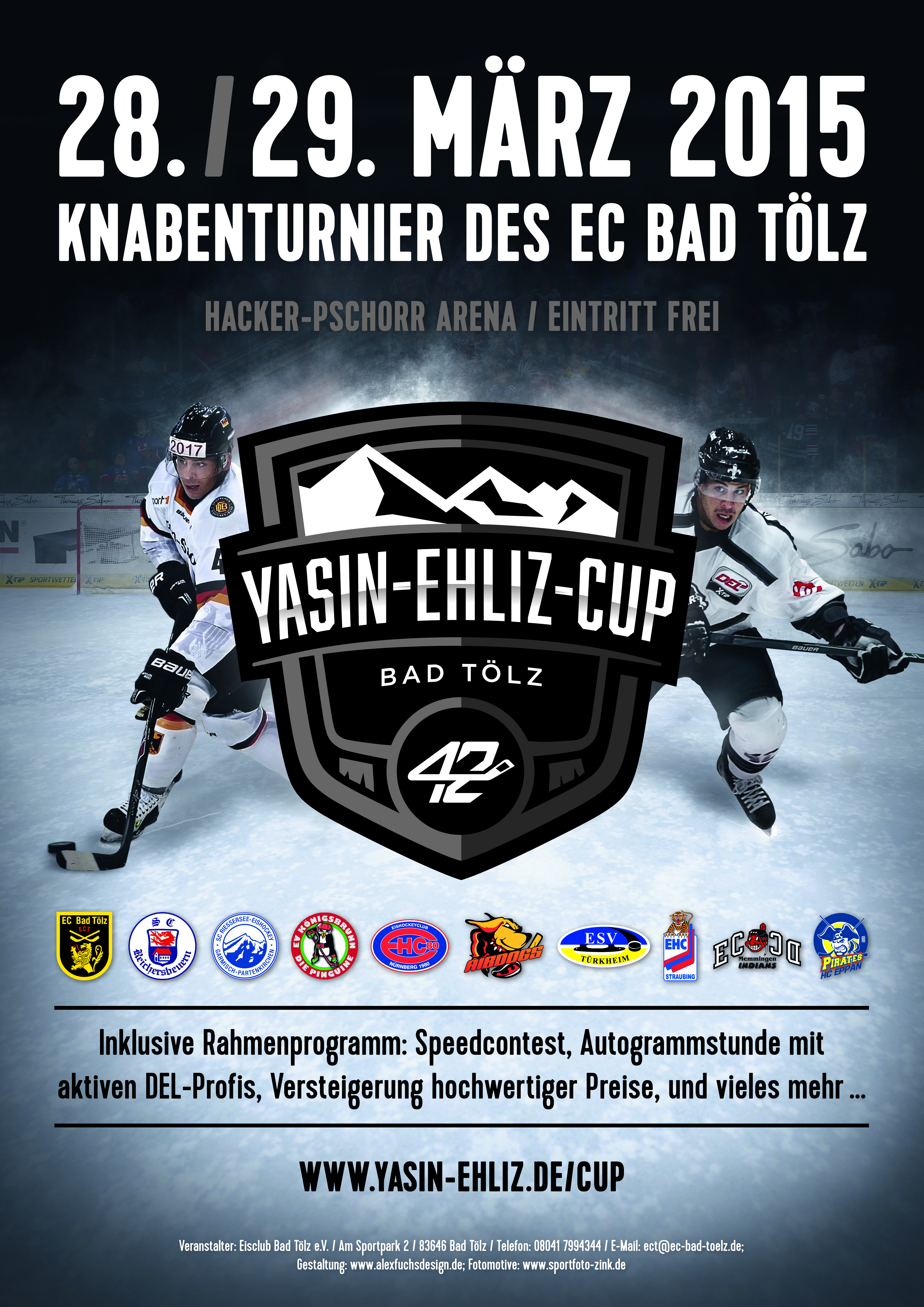 (Oberliga-Tölz) Am 28. und 29. März 2015 ist es endlich soweit, der Yasin-Ehliz-Cup feiert seine Premiere. In der HACKER-PSCHORR Arena in Bad Tölz geht es dann für zehn Knabenmannschaften um einen großen Wanderpokal. Das interessante Teilnehmerfeld ist in zwei Gruppen geteilt, in Gruppe A müssen die Teams aus Riessersee, Bad Aibling, Nürnberg, Memmingen und Reichersbeuern ran, während die Tölzer es mit den Knaben aus Königsbrunn, Straubing, Türkheim und Eppan (Südtirol) zu tun bekommen.