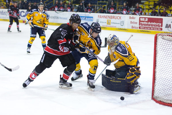 Doch was die Füchse am heutigen Abend boten, überraschte die Trappers scheinbar so sehr, dass sie im ersten Drittel nicht ins Spiel fanden, oder sagen wir besser finden durften. Von den Duisburgern im eigenen Drittel eingeschnürt konnten sie nur von Glück sprechen, dass sie zum ersten Pausentee nicht schon fünf oder gar 6:0 zurück lagen. Wie entfesselt huschten die Eisflitzer des EV Duisburg, an der Bande unterstützt von Interimscoach Uli Egen und dem noch verletzten Manuel Neumann, über das Eis der Scania Arena. So konsterniert waren die Trappers, dass sie gar in Überzahl ein Tor kassierten. Eiskalt serviert von Andre Hübscher, der mit seinem Doppelschlag (11./14.) innerhalb von 3 Minuten dass 2:0 in den ersten 20 Minuten markierte. Das zweite Drittel war nicht mehr allein durch die Füchse geprägt. Die Niederländer kamen besser ins Spiel und verkürzten in Überzahl durch Willems (26.), doch die Füchse hielten dagegen, kämpften, gingen in die Zweikämpfe und verdienten sich das 3:1 durch Tepper (37.) nach einem wunderschönen Pass von Gärtner - ein gelungener Einstand für den alten Neu-Duisburger, der erst in dieser Woche verpflichtet wurde. Es sollte aber nicht Teppers letzte Duftmarke in diesem Spiel sein. Ein ausgeglichenes zweites Drittel ging zu Ende. Doch die Füchse wollten mehr und es gelang. Eine kurze Drangphase der Trappers im letzten Drittel überstanden sie dank eines gut aufgelegten Stefaniszin zwischen den Pfosten und vollem Einsatz aller heimischen Protagonisten. Ziolkowski zum 4:1 (44.) und kurz vor dem Abpfiff schlägt Tepper (60.) zum zweiten Mal zu. Vom eigenen Bullykreis trifft er ins leere Tor der Holländer. Willkommen zurück in Duisburg Marvin! Ein kompakte Mannschaftsleistung - die Füchse haben gehalten, was sie versprochen haben. Eine erfolgreiche Verteidigung der Spitzenposition in der Oberliga-Nord, Balsam für die Seelen und ein Ruck in die richtige Richtung.