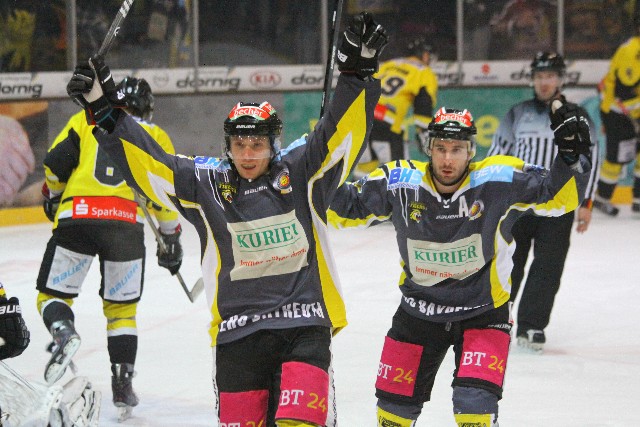 In der zweiten Pause schien Tigerdompteur Waßmiller aber wieder einmal die richtigen Worte gefunden zu haben. Langsam kämpften sich die Oberfranken zurück ins Spiel, fassten sich noch mal ein Herz und schwammen sich frei. Bei einem Unterzahlkonter fand Toptorjäger Geigenmüller zwar noch seinen Meister im Tölzer Torhüter, doch nach 50 Minuten belohnte Bartosch sich mit seinem unermüdlichen Einsatz selbst, als er ein Gewühl im Zentrum vor Goll zum Ausgleich nutzen konnte. Dadurch bekamen die Tigers sprichwörtlich die zweite Luft und setzten nach. Der Ruck durch das Team war auch auf den Tribünen zu spüren, von wo nun auch noch einmal neue Unterstützung kam. Besonders die Paradereihe des EHC drehte auf und tatsächlich spielte der spielstarke Kolozvary mit einem herrlichen Pass Geigenmüller in der Mitte an, der trocken das viel umjubelte 3-2 markierte. Die Löwen mobilisierten danach nochmals alles und versuchten zurück zu schlagen. Etwa eine Minute vor Ende nahm man in Überzahl Goalie Goll vom Eis und drückte mit 6 gegen 4 Feldspielern. 10 Sekunden vor Ende hatte man auch schon den Torschrei auf den Lippen, doch landete die Scheibe aus bester Position am Pfosten und es blieb beim knappen Sieg des EHC. Trainer Waßmiller war mächtig stolz auf sein Team, gab mit dem Satz „der Eishockeygott war heute auf unserer Seite“ aber auch zu, dass man speziell im zweiten Drittel auch die nötige Portion Glück hatte.