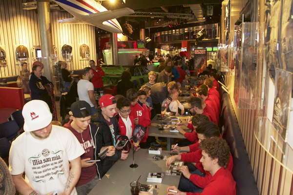 ... dann muss man auch 'mal entspannen, den Gang raus nehmen und den Eishockeygott einfach einen netten Mann sein lassen. So lud der EV Duisburg am gestrigen Tag zum Familientag ins Planet Hollywood Duisburg, dem aktuellen Trikotsponsor. Nach einem Mannschaftsessen ohne gezählte Kalorien zwischen 'Terminator' Arnold Schwarzenegger, den 'Gremlins' und dem Schwert von 'Gladiator', welches sich zum Glück nicht als das des Damokles outete, war man für die Fans, die schon ungeduldig warteten, da. Mit im Gepäck der Kufencracks aus dem Fuchsbau waren die neuen 'Player-Cards', aber auch Schals, Trikots, selbstgeschossene Fotos und erhaschte Ausrüstungsgegenstände der Fans mussten unterschrieben werden. Auch der kleinste und gleichzeitig, mit einem Alter von wenigen Wochen, jüngste Fuchsfan Nachwuchs war vor Ort und wurde ganz liebevoll von den 'harten' Jungs in den Fuchsbau aufgenommen. Alle Spieler standen den Fans in der glamourösen Hollywood Atmosphäre des Planet Hollywood selbstredend auch für Fotos zur Verfügung. Auch 'Manni', das lebensgroße Maskottchen der Füchse durfte an diesem Nachmittag nicht fehlen. Das vom Tisch essen wurde ihm zwar untersagt, aber er hatte allemal genug als beliebtes Fotomotiv zu tun!