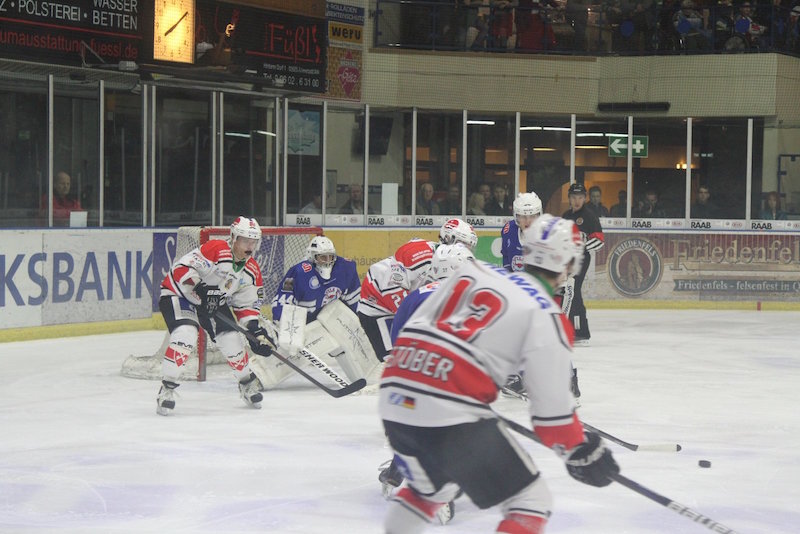 Der erste Treffer schien den „blauen Teufeln“ aus Weiden für den Schlussabschnitt Auftrieb zu verleihen, denn diesen begannen sie mit hohem Tempo. Das Spiel, das sehr umkämpft und schnell war, sollte nun zahlreiche Torraumszenen bekommen. Die Domstädter verpassten es mit einem weiteren Treffer die vermeintliche Vorentscheidung zu besorgen. Diese hätten alleine Thomas Schreier, Vitali Stähle und Svatopluk Merka zwischen der 46. und 48. Minute besorgen müssen. Wie so oft klingelt es dann aber im eigenen Kasten und schon ist der Vorsprung nur noch verschwindend gering. So erging es auch am Freitagabend dem EVR, der in der 52. Spielminute den 2:3-Anschlusstreffer durch Weidens Konstantin Firsanov hinnehmen musste. Plötzlich war in einem schon als gewonnen geglaubten Derby wieder pure Spannung und Emotion drin. Josef Hefner peitschte gemeinsam mit den Heim-Fans seine Mannschaft nach vorne, die nun aus allen Rohren feuerte. Der EVR hielt aber stand und vereitelte eine Chance nach der anderen. Dessen Trainer Doug Irwin erkannte die Zeichen der Partie früh und sorgte in der 59. Spielminute mit einer Auszeit für kurzzeitige Beruhigung der Gemüter, aber schon fünf Sekunden danach zog Louke Oakley beim Bully eine Strafzeit und sorgte für großes Zittern beim Gast. Jetzt nahm auch Weiden seine Auszeit, exakt 54 Sekunden vor der Sirene und holte Goalie Daniel Huber zu Gunsten eines sechsten Feldspielers vom Eis. Auch mit zwei Spielern mehr gelang es den Hausherren aber nicht mehr das Ergebnis zu egalisieren. Zwar brannte es vor dem EVR-Tor lichterloh, doch die wacker kämpfenden Regensburger warfen sich in jeden Schuss und wurden am Ende für ihren unermüdlichen Einsatz belohnt.