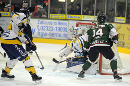 Dieser unbedingte Siegeswille hat mittlerweile nicht nur die Serie der gewonnenen Spiele auf 13 erhöht, sondern auch den Vorsprung an der Tabellenspitze auf zehn und mehr Punkte gegenüber den Verfolgern aus Tilburg, Hamburg, Duisburg und Halle ausgebaut. Dass auch eine Partie ohne Treffer sehr spannend sein kann, war zwei Drittel lang zu sehen. Beide Teams waren von Beginn an hellwach und sehr konzentriert. Die erste Möglichkeit bot sich den Gästen bereits nach 29 Sekunden, dann hatten die Gysenbergern die ersten Chancen. Spätestens nach dem ersten Powerplay um die 7. und 8. Minute konnte man aber erkennen, dass mit Ian Meierdres der TopTorhüter der Liga nur sehr schwer zu überwinden sein würde. Sein Gegenüber Michel Weidekamp, die Nummer zwei in der aktuellen Goalie-Statistik, stand dem aber in nichts nach. Das anerkannten auch beide Trainer nach Spielende. So gab es viele gute Angriffe, wechselweise auf beiden Seiten. Aber die Null sollte lange Zeit doppelt auf der Anzeigentafel stehen. Ab der 34. Minute gab es dann knapp anderthalb Minuten sogar eine 5:3-Überzahl für den Herner EV. Aber die Gäste überstanden auch diese Druckphase um dann selber wieder gute Angriffe zu liefern. So musste Michel Weidekamp zehn Sekunden vor der zweiten Drittelpause noch einmal beherzt eingreifen. Im Schlussabschnitt nahm die Spannung noch weiter zu und die stimmgewaltige Kulisse am Gysenberg konnte dann auch nur 65 Sekunden nach Wiederanpfiff zum ersten Torjubel anstimmen.