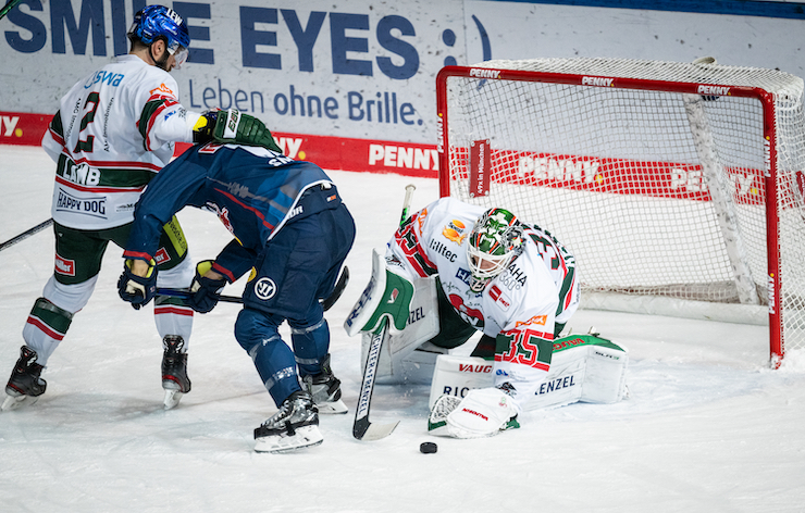 PENNY-DEL (München/PM) Zweites Derby gegen die Augsburger Panther in dieser Saison, zweiter Sieg für Red Bull München: Der Spitzenreiter der PENNY DEL hat sich in einem engen Duell mit 3:2 (2:0|0:2|1:0) durchgesetzt. Austin Ortega, Ben Smith und Andreas Eder erzielten vor 5.238 Zuschauern die Tore. Der glänzend aufgelegte Keeper Daniel Allavena hatte ebenfalls einen großen Anteil am fünften Derby-Erfolg gegen die Panther in Serie.