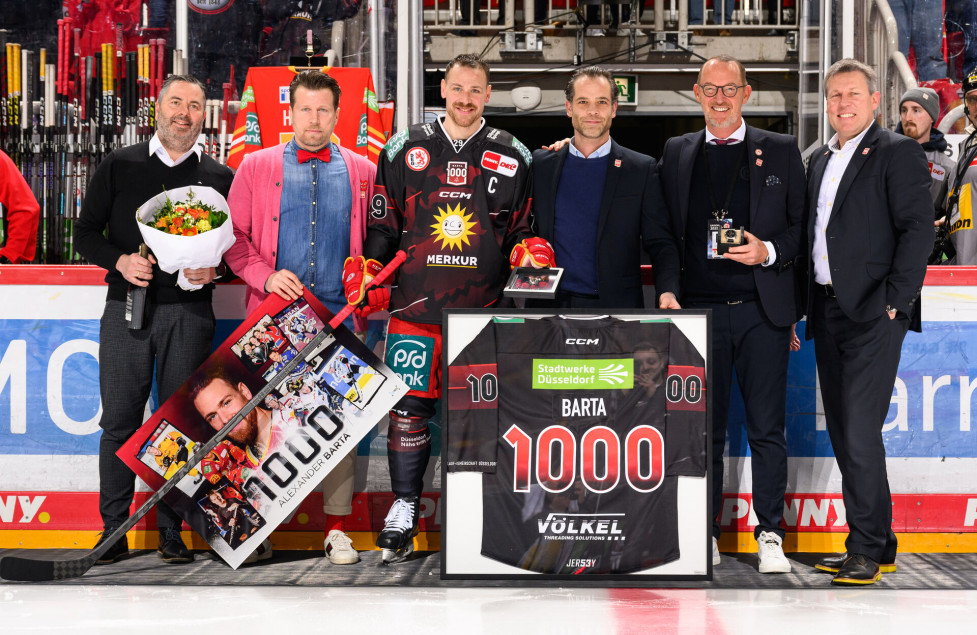 Vor der Partie standen aber erst einmal andere Dinge im Mittelpunkt. Zunächst wurde Kapitän Alex Barta geehrt, der als zehnter Spieler Mitglied im 1000er-Club der PENNY DEL wurde. Aus diesem Anlass gab es den ganz großen Bahnhof mit Ehrung vor dem Spiel, speziell angefertigtem Ring, Videogrüßen alter Weggefährten und eine Ehrenrunde vor dem ersten Bully. Freude und Trauer lagen heute eng beisammen.