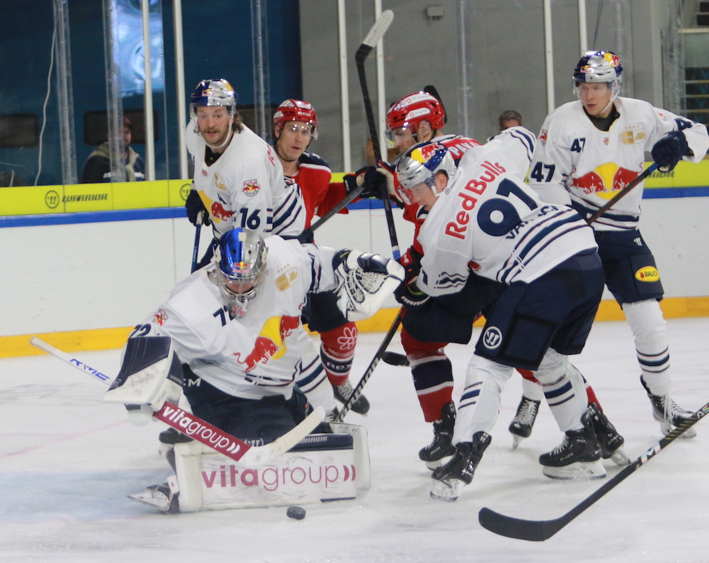 Von Beginn an wurde mit viel Körpereinsatz auf beiden Seiten agiert, es krachten häufig Spieler in die Flex-Banden, zur Freude der Fans in der gut gefüllten Arena. Man schenkte sich nichts und spielte aggressiv und temporeich. Im Red Bulls Tor stand Daniel Allavena, der einen sicheren Eindruck bot. Kastner hatte kurz vor der Drittelpause die größte Chance bei einem Alleingang, scheiterte aber und ging es torlos in die Pause.