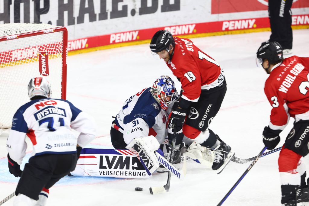 Im zweiten Drittel setzte sich die Überlegenheit der Haie fort. Nachdem Brady Austin noch an Niklas Treutle scheiterte, konnte Marc Louis Aubry in der 25. Minute den Puck über die Linie stochern. Die Nürnberger wurde Minuten lang im eigenen Drittel gehalten. In der 35. Minute wurde Alexandre Grenier durch Nick Bailen und Moritz Müller glänzend freigespielt, so dass er im Slot nur noch die Kelle hinhalten mußte. Nich mal eine Minute später gelang Alexandre Grenier nach einer ähnlichen Kombination noch das 5:0. Mit Standing Ovations für die Haie ging es in die zweite Drittelpause.