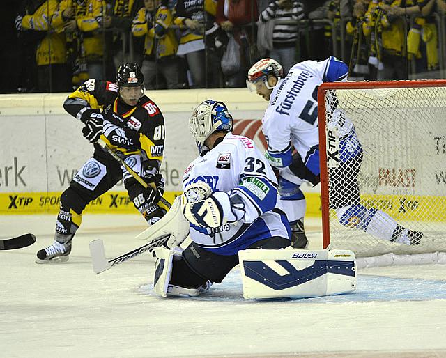 Der letzte Abschnitt sah weiterhin ein unverändertes Bild. Ein eigentlich ausgeglichenes Spiel führte letztlich zu den besseren Chancen auf Seiten der Schwarzwälder. Doch in der 44. Minute war es der heute starke Mieszkowski, der die Scheibe eroberte und sich allein durchtankte, um dann zum 4:6 einzuschießen! Genau 44 Minuten waren gespielt, da bekam Perrault die nächste Strafzeit. Nach einem Check gegen den Kopf musste er für 2+10 Minuten vom Eis. Die Pinguine aber überstanden diesmal die Unterzahl. In der 48. Minute aber musste man gleich wieder mit einem Spieler weniger agieren, als Fischer hinausgestellt wurde. Erneut aber blieb man unbezwungen und schaltete erneut auf Angriff um, doch immer wieder fehlte der letzte Pass, der zu ungenau kam. Die Pinguine waren jetzt klar in der Initiative, doch in der 54. Minute der Konter der Gastgeber, die mit 2 auf 1 auf Klein zuliefen, doch der junge Keeper blieb Sieger.