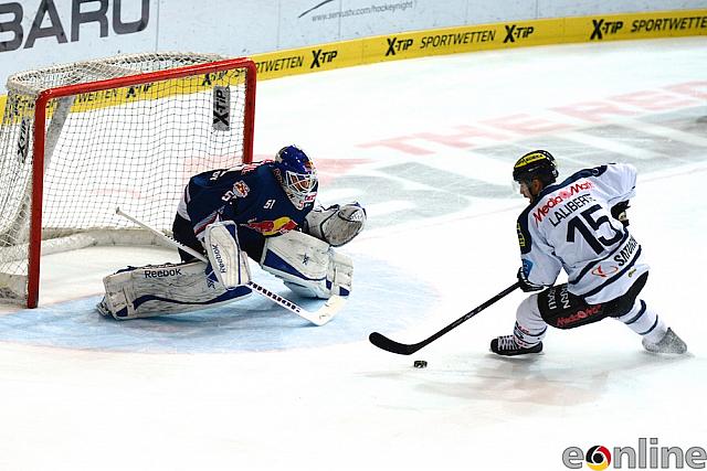 Vom Eröffnungsbully weg zeigten beide Teams, dass sie in der Offensive viel zu bieten haben. Bei Scheibengewinn ging es direkt in Richtung des gegnerischen Tores. Allerdings standen auch die Defensivreihen sicher, so dass die Torhüter zunächst wenig zu tun hatten. Den ersten gefährlichen Abschluss der Gäste aus München hatte Daniel Sparre, der Timo Pielmeier mit einem Schlenzer von halblinks prüfte (8.). Bitter für die Red Bulls: Nach einem Check verletzte sich Matt Smaby. Für ihn war die Partie nach zwölf Minuten gelaufen. Kurz darauf gingen die Ingolstädter mit ihrer ersten besseren Chance in Führung. Patrick Hager eroberte in der Münchner Zone die Scheibe, spielte vor das Tor auf Derek Hahn und der vollstreckte eiskalt zum 1:0 für den amtierenden Meister (15.). Danach zeigten die Red Bulls, dass auch sie stark forechecken können. Die Ingolstädter kamen in dieser Phase kaum noch zu einem gepflegten Spielaufbau. Kurz vor der Pause hatte Alex Barta in Überzahl den Ausgleich auf dem Schläger, er scheiterte allerdings an Pielmeier.
