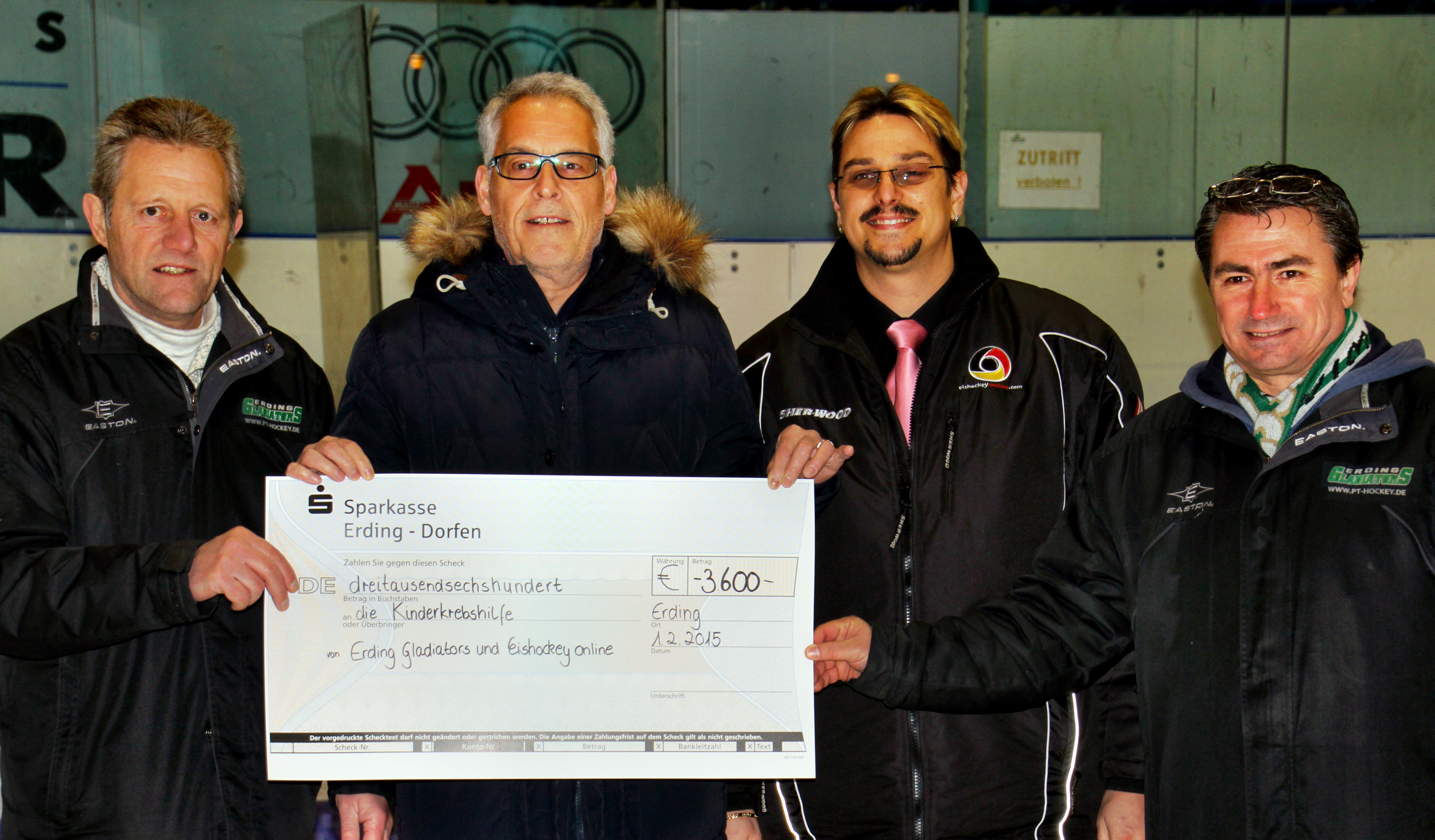 Am heutigen 1. Februar 2015 wurde beim Oberligaspiel in Erding ein Scheck im Wert von EUR 3.600,00 von eishockey-online hilft e.V. an den Förderverein vom berühmten Sportreporter Günter-Peter Ploog zu Gunsten der Kinderkrebshilfe Mainz übergeben. Das Geld stammt aus der Pinktoberaktion, die eishockey-online hilft e.V. zusammen mit den Erding Gladiators im Oktober 2014 durchgeführt hatte.