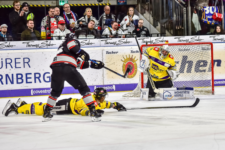 In der Schlussphase versuchte man noch alles mit einem sechsten Feldspieler, doch Frank Mauer traf mit seinem zweiten Tor am heutigen Tag das leere Tor zum 2:5. Dies bedeutet das Ende der Serie von sechs Siegen in Folge, doch Krefeld verbleibt mit aktuell 10 Punkten Vorsprung auf Nürnberg auf dem 10. Tabellenplatz und damit auf Playoffkurs.