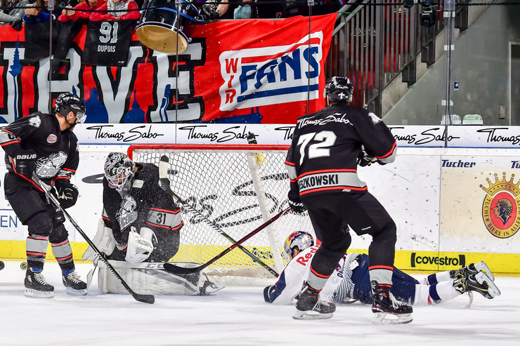 Die war dann recht schnell Geschichte. Noch keine zwei Minuten waren gespielt, da hatten die Grizzlys zum zweiten Mal zugeschlagen. Torschütze war Alexander Weiß. Und die Niedersachsen drehten jetzt richtig auf. Jeff Likens und Jeremy Dehner schossen die Hausherren mit 4:2 in Führung. Die erste Saisonniederlage der DEG nahm Form an. Eine Überzahl gut fünfeinhalb Minuten vor dem Ende bot für Rot-Gelb dann die große Chance zum Anschlusstreffer. Und der gelang blitzschnell. Alex Barta mit dem Tor – da waren nur zehn Sekunden vergangen. Die DEG warf jetzt alles nach vorne, nahm Mathias Niederberger vom Eis und hätte dann auch fast noch den Ausgleich geschafft. 15 Sekunden vor Schluss traf Alex Barta den Pfosten, unmittelbar vor der Schlusssirene erneut. Den Abpraller verwandelte Philip Gogulla und der Jubel war groß. Aber die Unparteiischen machten dem einen Strich durch die Rechnung. Nach Videobeweis stellten sie fest, dass die Zeit abgelaufen war ehe die Scheibe die Linie überschritten hatte. So blieb es bei der denkbar knappen 3:4-Niederlage.