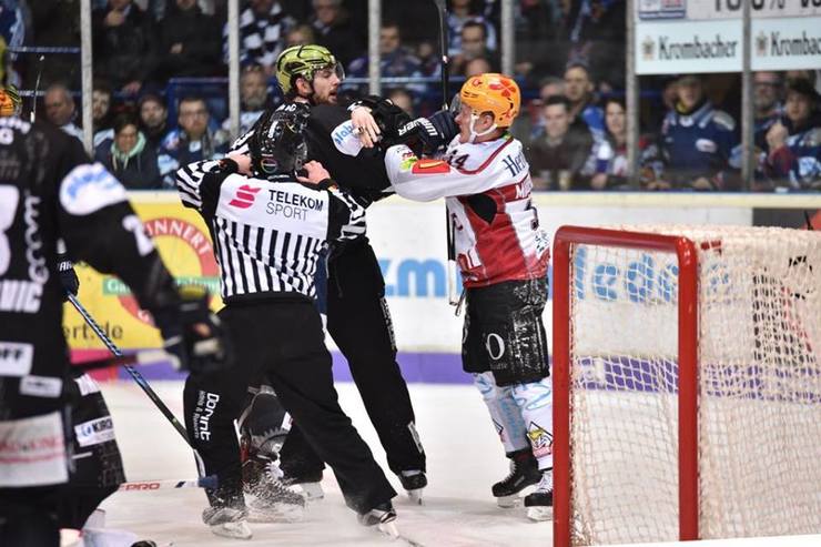 Schwartz schoss die Scheibe aber über das Tor und fasste sich danach, zu Recht, an den Kopf. Nur eine Minute später fand sich Mike Hoeffel alleine vor Dahm wieder. Iserlohns Torhüter blieb standhaft und verhinderte den ersten Gegentreffer. Wäre es zum Treffer gekommen, hätte er nicht zählen dürfen. Das Tor wäre aus einem glasklaren Abseits entstanden. Nach einem wilden Auf und Ab, sowie ein paar Meinungsverschiedenheiten, gingen beide Mannschaften mit einem torlosen 0:0 in die Kabinen.