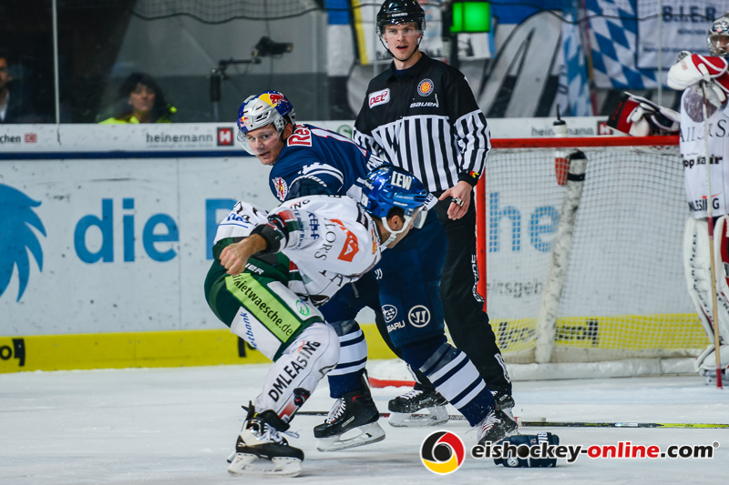 Das Derby begann spektakulär. Konrad Abeltshauser schoss die Red Bulls in der zweiten Minute in Führung. Nur 35 Sekunden später glichen die Panther durch Derek Dinger aus. Danach waren es die Hausherren, die für die spielerischen Höhepunkte sorgten. Frank Mauer belohnte sein Team mit dem Treffer zum 2:1 (11.). Noch vor der ersten Pause hatte Jon Matsumoto das 3:1 auf dem Schläger, er scheiterte aber nach einem Solo an AEV-Torhüter Olivier Roy (18.).