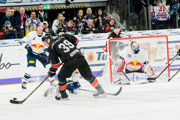 Die Nürnberger Arena platzte aus den Nähten und eine stellenweise ohrenbetäubende Lautstärke lud zum Spitzenspiel der Deutschen Eishockey Liga: Der EHC Red Bull München war zu Gast bei den Thomas Sabo Ice Tigers. Das Ziel des Spiels war klar: Der Sieger ist die beste Mannschaft Deutschlands. Dementsprechend zahlreich vertreten waren auch die Anhänger der Red Bulls, die mit Hilfe von Schiffen, Zügen und Bussen anreisten. Zurück auf dem Eis war Leonhard Pföderl, weshalb Rob Wilson (Headcoach Nürnberg) auf Petr Pohl verzichten musste. Auch der Schwede Nichlas Torp musste erneut in Zivil zuschauen, da er als überzähliger Ausländer keinen Platz im starken Kader der Franken fand. Don Jackson (Headcoach München) schenkte David Leggio sein Vertrauen, im Tor der Hausherren startete Niklas Treutle.