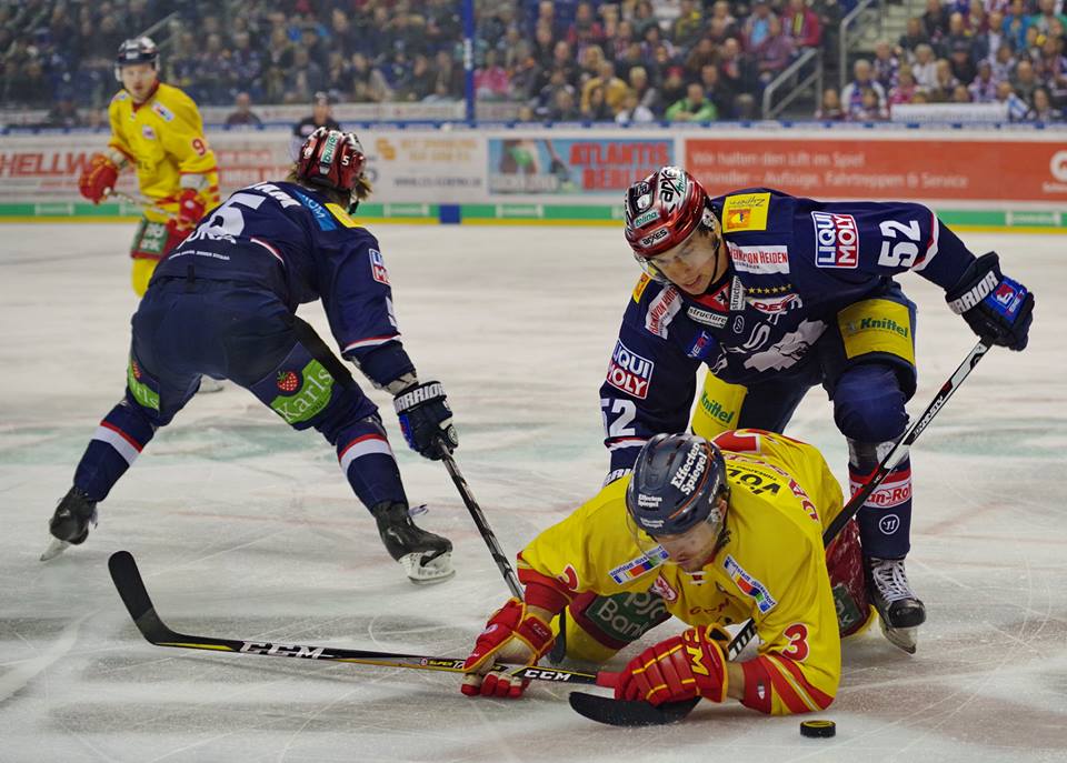 Das Selbstbewusstsein aus den vergangenen siegreichen Partien war beim achtmaligen Deutschen Meister zu spüren. Obwohl es in der jüngeren Vergangenheit eher weniger in Berlin zu holen gab, die Mannschaft hier zurücklag und ohnehin nicht grade als Favorit in die Partie gegangen war, kamen die Düsseldorfer weiter zu Chancen. Eine Viertelstunde vor Schluss nutzte Kapitän Darryl Boyce eine davon zum verdienten Ausgleich. Die Vorlagen kamen von Eddi Lewandowski und Bernhard Ebner. Als dann auch noch eine weiter Drei gegen Fünf-Unterzahl dieses Mal schadlos überstanden war, deutete vieles bereits auf eine Verlängerung hin. Gegen Ende der regulären Spielzeit und dann auch in der Overtime schwang sich Mathias Niederberger zum Punktegaranten auf. Erst hielt er mehrfach stark, dann parierte er einen Penalty von Danny Richmond. So musste die Entscheidung im Penalty-Schießen fallen. Und auch da behielt der gebürtige Düsseldorfer die Nerven und entschärfte alle drei Berliner Versuche. Auf der Gegenseite traf John Henrion zum zweiten Mal an diesem Abend und sorgte für rot-gelben Jubel.