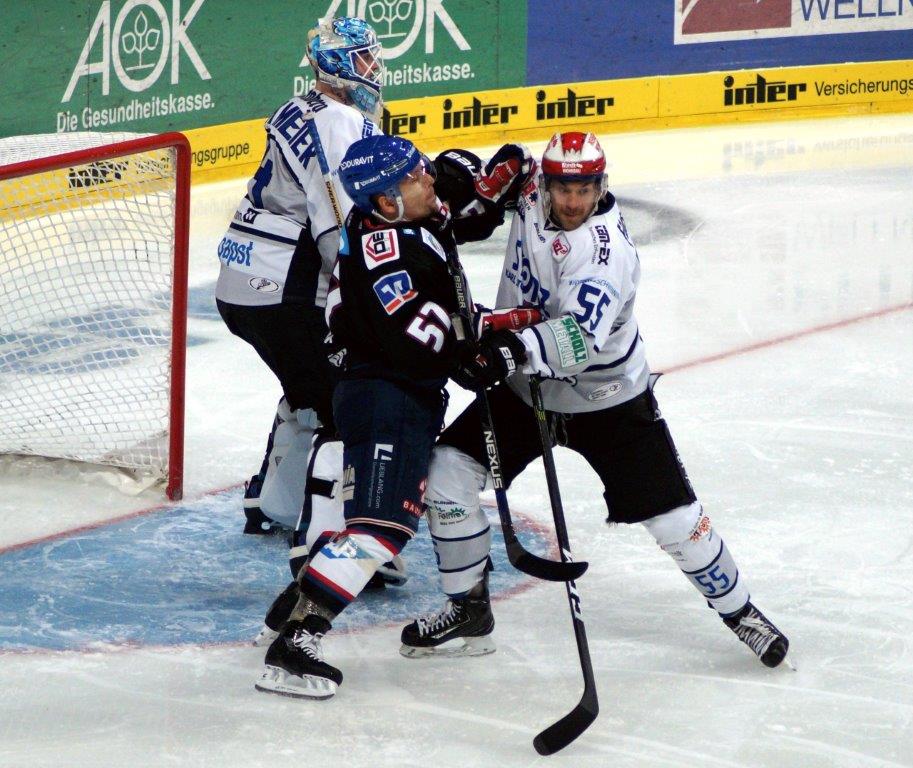 Im Schlussabschnitt galt es einmal mehr ein Spiel zu drehen. Und das letzte Drittel begann verheißungsvoll. Denn in eigener Überzahl versenkte Matthias Plachta endlich den Puck im gegnerischen Netz und brachte seine Blau-Weiß-Roten so auf 1:2 heran (44.). Und kurz darauf bot sich gleich zweimal Gelegenheit nachzulegen. War beim Versuch von Garrett Festerling der Winkel einfach zu spitz, so wusste nur zwei Minuten später Straubings Goalie Matt Climie den Ausgleich zu verhindern. Irgendwie hatte er beim Schuss von Daniel Sparre gerade noch rechtzeitig die Schoner runterbekommen (49.).