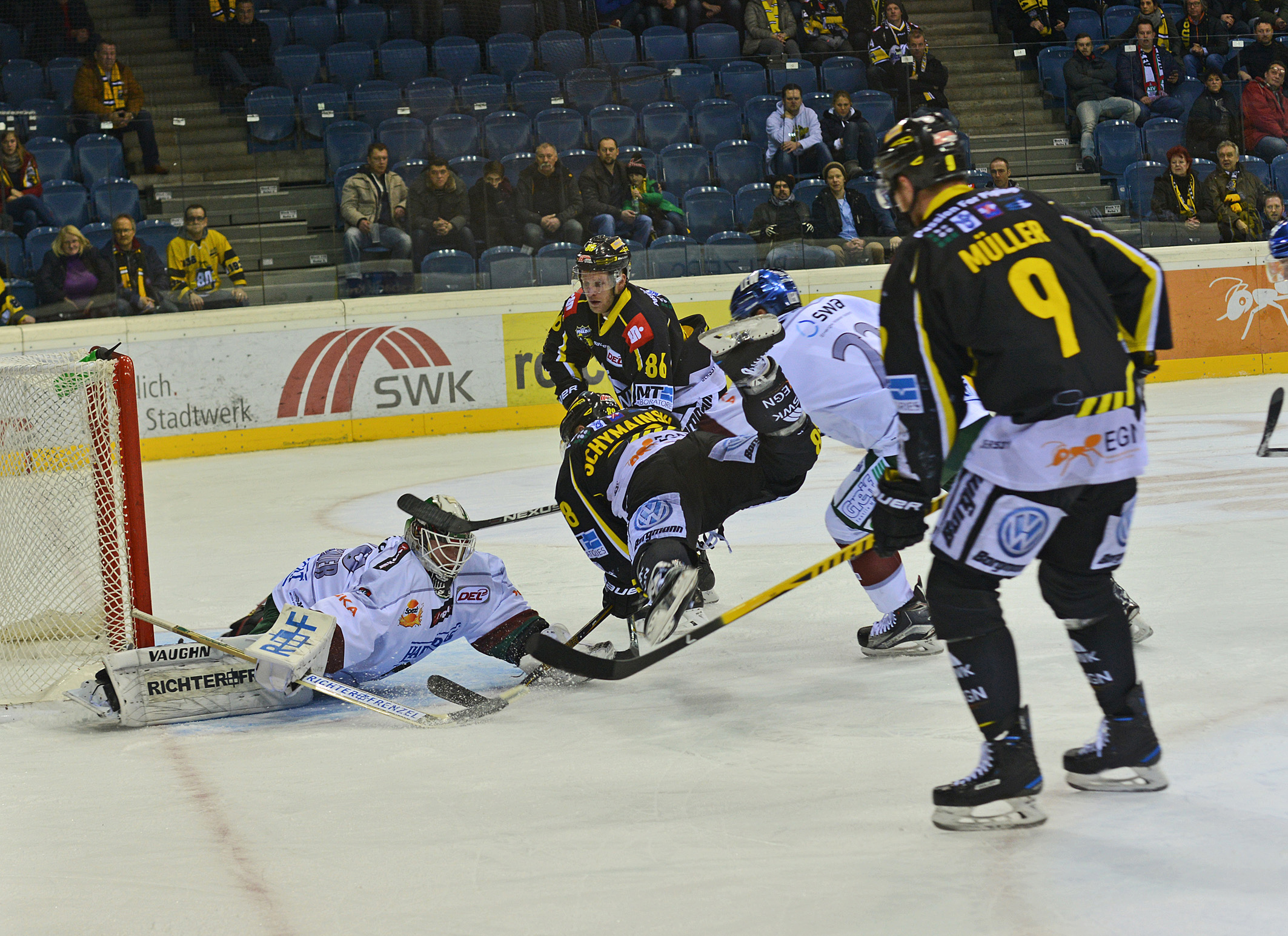 Die Kölner zeigten von Beginn an, dass sie nicht gewillt waren, eine weitere Niederlage in einem prestigeträchtigen Derby zu kassieren. In der Anfangsphase des Spiels war die Mannschaft von Cory Clouston das aktivere Team mit mehr Aktionen in Richtung des gegnerischen Tors. Die beste Chance für die Gäste hatte Alexander Sulzer, dessen Schuss von der blauen Linie zuerst an den rechten Pfosten und von dort an die Kufen von Mathias Niederberger sprang, von wo er wiederum hauchdünn am anderen Pfosten vorbeistrich (6.). Die volle Aufmerksamkeit der Rot-Gelben, die heute ohne Tim Schüle, Alex Preibisch und – natürlich – Daniel Kreutzer aufliefen, lag zunächst darauf, dem Ansturm der Haie standzuhalten.