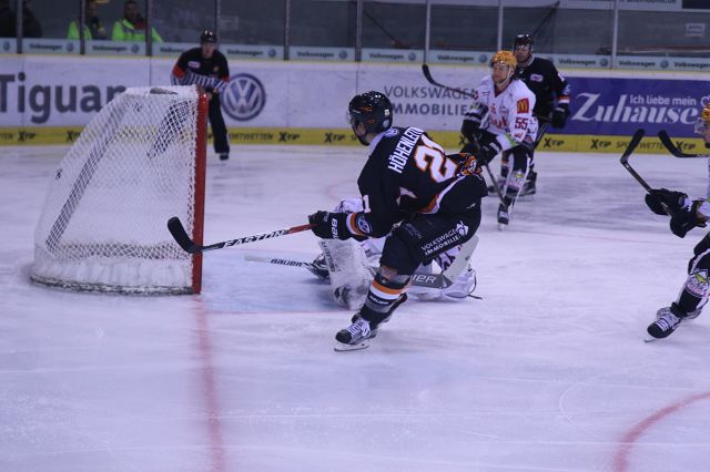 Nach dem Seitenwechsel spielten beide Teams in der Abwehr zu nachlässig, so dass sich das Spiel weiter munter entwickeln konnte. Keiner hätte sich in der Phase bis zum Powerbreak über Gegentore beschweren müssen. Die Tigers mussten sich sogar noch anstrengen die Vorlagen der Gäste auszulassen. Dabei wäre ein zweiter oder sogar dritter Treffer nicht nur möglich gewesen, sondern auch bitter nötig. Vor allem wenn man weiß, was die Tigers schon aus so mancher vermeintlich sicheren Führung gemacht haben. Doch die Wolfsburger mit ihrer kleinen Schar an angereisten Fans machten es auch nicht besser. Zwar konnte auch immer wieder die Abwehr der Tigers unter Druck gesetzt werden, zählbares sprang aber auch nach vierzig Minuten heraus. Steven Zalewski hatte dann noch die beste Möglichkeit kurz vor Drittelende aber für den tüchtigen Sebastian Vogle im Tor rettete der Pfosten.