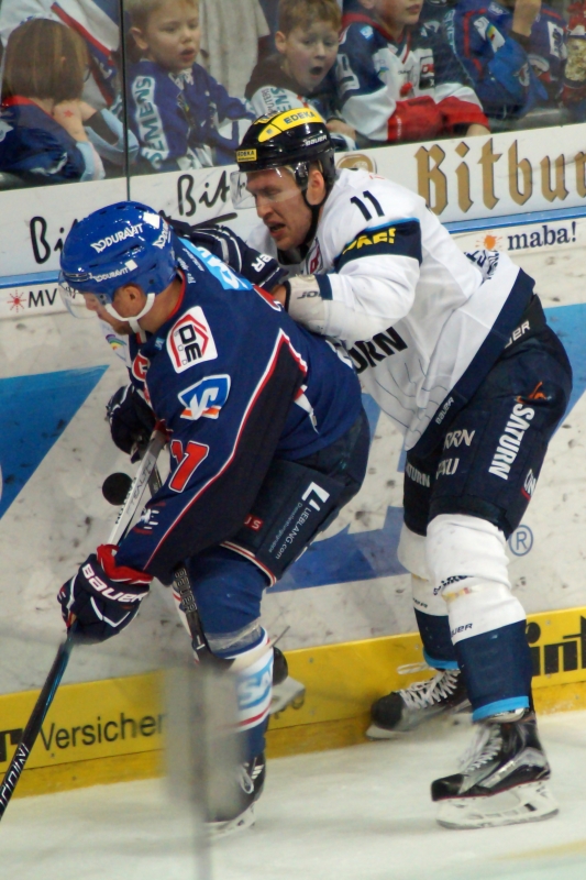 Aber, die Tatsachenentscheidung ist stärker. So nahmen die Gäste aus Mannheim im Mittelabschnitt schnell Fahrt auf und verschärften die Parforce und das Tempo. Krefeld, das mit dem personellen Notstand zu kämpfen hatte (Am Morgen hatte sich noch Marcel Müller krank gemeldet) pfiff schon ab Mitte des Drittels Kräfte mässig aus dem letzten Loch. Mannheim clever und abgebrüht nutzte drei Krefelder Strafen nacheinander und drehte das Match. Erst traf Kolarik (25.), dann der Neuzugang Colaiacovo (34.) und zu schlechter Letzt Carle (37.) zur komfortablen Gästeführung.