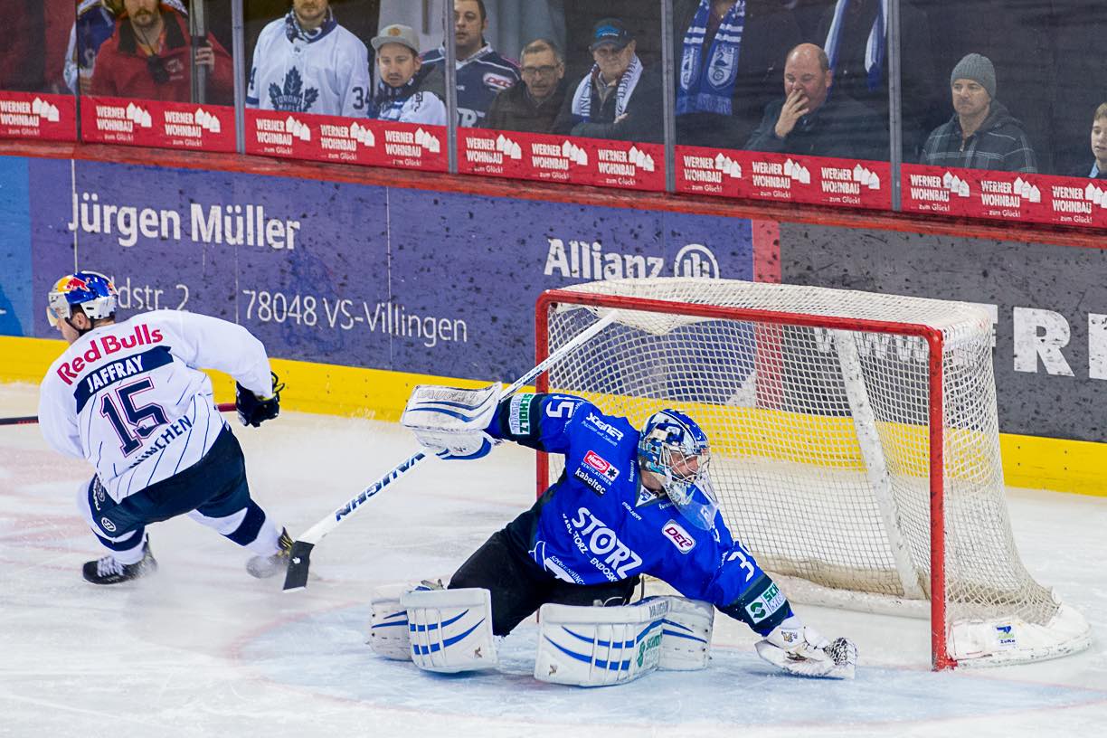Unterschiedlicher konnten die Voraussetzungen vor der Partie zwischen den Schwenninger Wild Wings und dem EHC Red Bull München nicht sein, schließlich war es die Partie des Tabellenletzten gegen den amtierenden Meister und aktuellen DEL-Spitzenreiter. Und die Gäste traten demnach selbstbewusst auf: Jung-Nationalspieler Maximilian Kastner gelang der erste Treffer für die Münchener. Nach dem ersten Wechsel kamen die Hausherren besser aus der Kabine. Jedoch standen beide Defensivreihen solide. Die Münchener Führung hielt bis ins Schlussdrittel. Hier hatten die Münchner kurz nach Wiederbeginn im Unterzahlspiel durch Jason Jaffray eine gute Einschussmöglichkeit, doch verzog der Münchner Angreifer nach einem Alleingang knapp. Jaffray war es dann, der wenig später seinen Teamkameraden Michael Wolf mit einem Zuckerpass an den langen Pfosten suchte - und fand: 2:0 für den Deutschen Meister, der die 2-Tore-Führung routiniert bis knapp zwei Minuten für Schluss verteidigte. Dann war es Daniel Schmölz, dem der verdiente Ehrentreffer gelang. Für die Red Bulls war es der siebte Sieg in Folge.