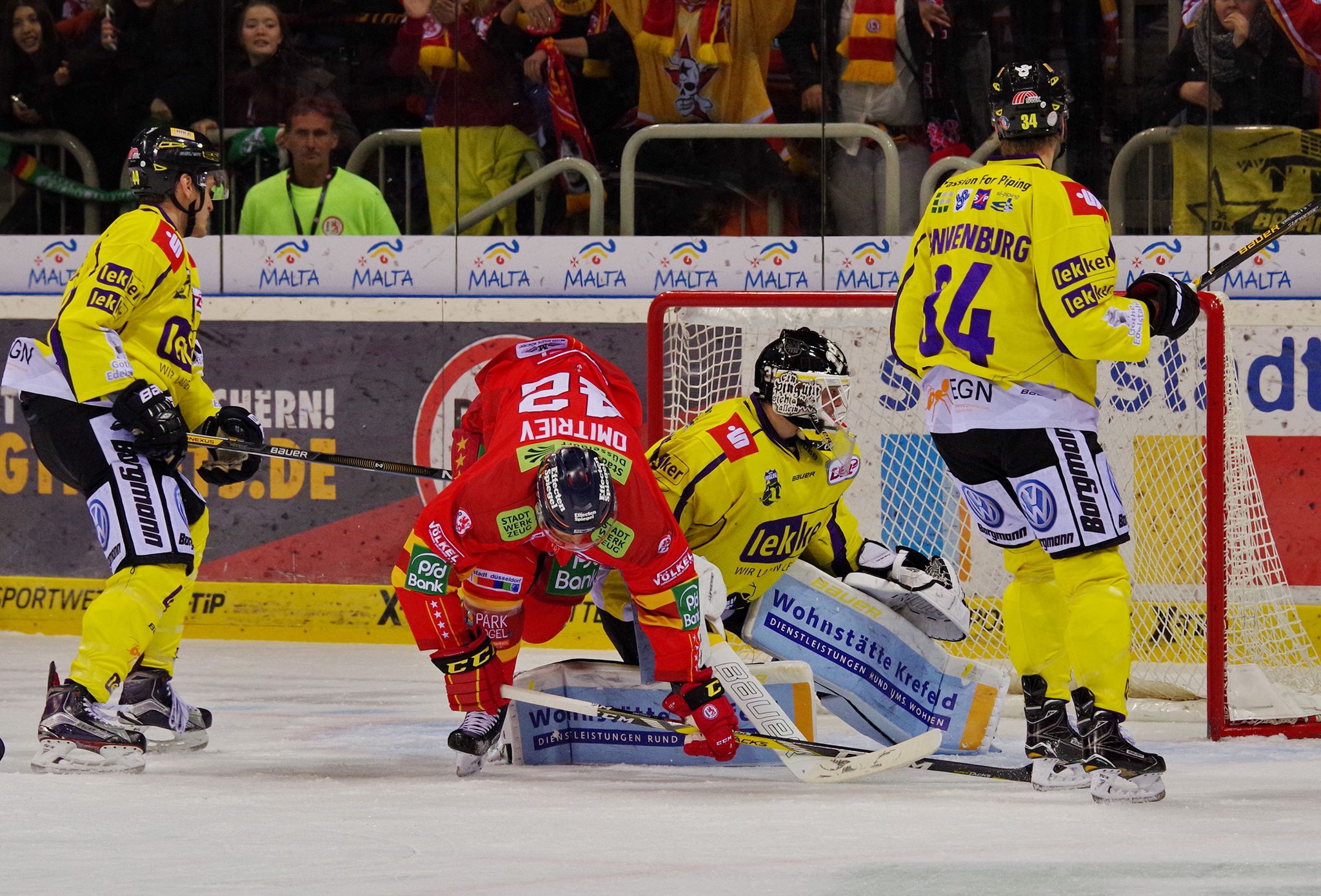 Nachdem sowohl die DEG als auch die Gäste aus Krefeld mit einer Niederlage in das Wochenende gestartet waren, zeigten beide Mannschaften von Beginn an, dass sie heute nichts zu verschenken hatten. Die erste gute Gelegenheit auf Seiten der Düsseldorfer verzeichnete Daniel Weiß, der mit einem Schuss aus dem hohen Slot am Krefelder Goalie scheiterte. In der Folge ging es hin und her. Brandon Yip war es, der in der achten Spielminute gleich zweimal die Chance auf den Führungstreffer hatte, doch noch wollte der Puck nicht hinein. Dann um ein Haar der Rückstand für die leicht überlegenen Rot-Gelben, Dragan Umicevic lief unbedrängt auf unsere Nummer 35 zu, brachte den Puck aber nicht im Gehäuse unter. Trotz vieler guter Möglichkeiten ging es mit einem leistungsgerechten 0:0 in die 1. Pause.