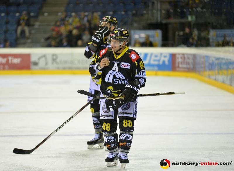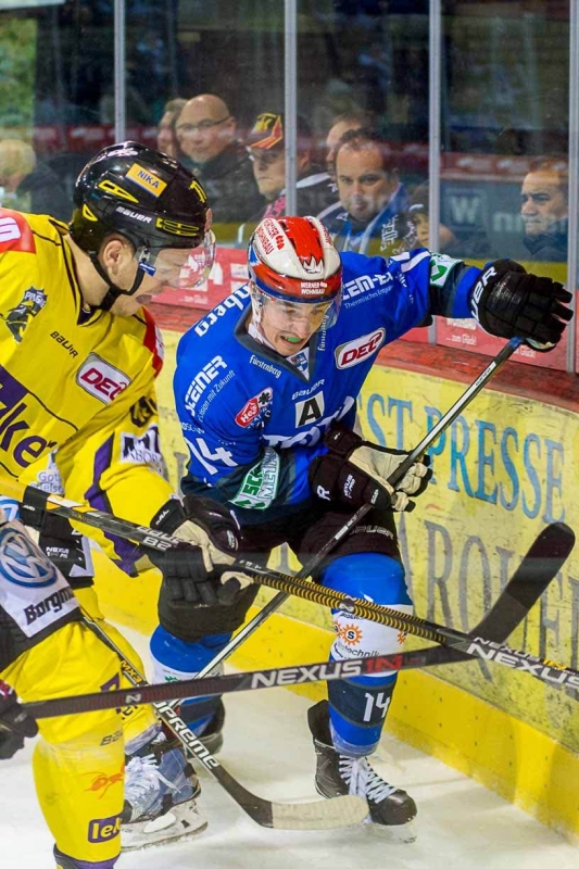 Beide Mannschaften tasteten sich zu Beginn erst einmal ab. Zwar konnte sich Krefeld leichte Vorteile erspielen, zwingende Chancen blieben aber auf beiden Seiten Mangelware. Die beste Chance zur Führung hatte Kyle Klubertanz. Sein Schuss traf aber nur an das Gestänge. Für den Höhepunkt des ersten Drittels musste eine kleine Faustkampfeinlage herhalten. Nach einem Gerangel vor dem Krefelder Tor ließ Kyle Sonnenburg die Handschuhe fallen und forderte Marc El-Sayed heraus. Die Schiedsrichter schickten beide Spieler mit 2+2+10 Strafminuten zum Nachdenken, Tore sollten in diesem Abschnitt keine mehr fallen.