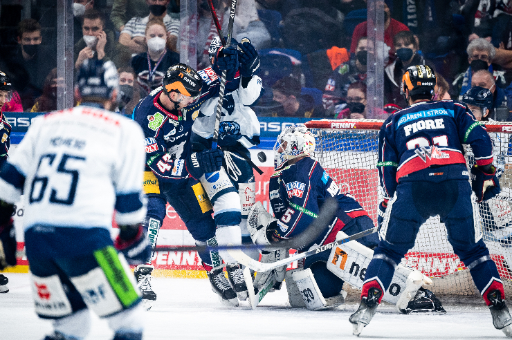 In der 52. Minute belohnten sich die Haie für das unermüdliche Anrennen. Landon Ferraro fälschte einen Schuss von Moritz Müller zum 4:2 ab.