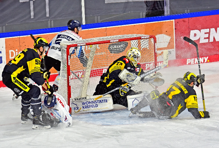 (PENNY - DEL/Schwenningen) (BM) Vor dem letzten Wochenende der Hauptrunde standen die Wild Wings unter Druck. In den verbleibenden Spielen musste das Team aus Schwenningen Punkte einfahren und auf einen Straubinger Patzer hoffen. Neben Max Hadraschek fehlte auch Darin Olver und Patrick Cerveny. Gleich zwei Mal zogen die Krefelder zwei Tore davon und Schwenningen schaffte jeweils den Ausgleich. Letzteren, erst 45 Sekunden vor dem Ende. In der Overtime machte der überragende Arthur Tianulin mit seinem vierten Treffer den Zusatzpunkt für Krefeld klar.