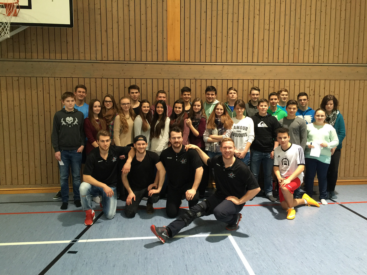 (DEL2-Rosenheim) Für die Aktion „Starbulls machen Schule“ kamen im Hinblick auf das Heimspiel der Starbulls Rosenheim gegen die Wölfe Freiburg die Mittelschulen in Wasserburg und Eiselfing zum Zuge. Topscorer C.J.Stretch, Stürmer Christian Neuert, Verteidiger Gustav Veisert und Torwart Timo Herden luden insgesamt rund 400 Schüler für den Spielbesuch am Sonntag zum Schnäppchenpreis von einem Euro ins Rosenheimer Stadion ein – und überraschten mit zwei ganz besonderen Aktionen