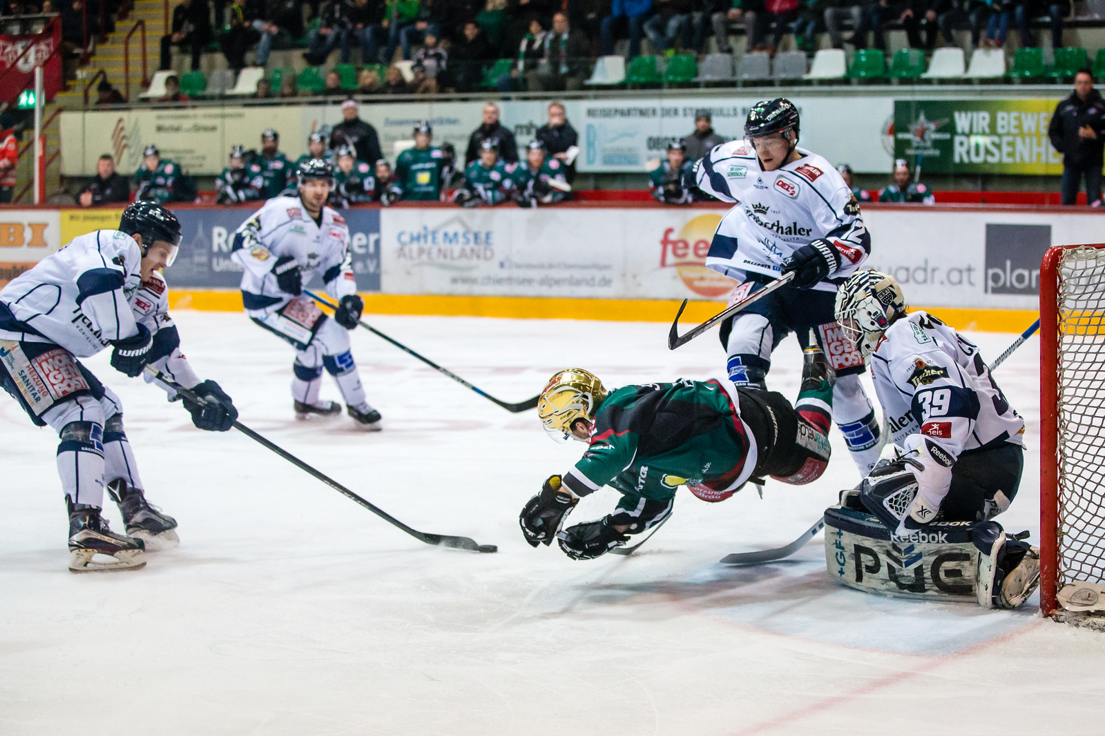 Die Starbulls mussten neben Andrej Strakhov, Gustav Veisert, Florian Gaschke und Christian Neuert auch auf ihren Top-Torschützen Wade MacLeod verzichten, der an den Folgen des ungeahndeten Check in der Schlussminute des Spiels gegen Ravensburg leidete. Im Tor der Grün-Weißen stand Lukas Steinhauer – und der musste schon nach zehn Sekunden mit einem starken Reflex das 0:1 verhindern, als Dresdens Goldhelmträger Harrison Reed die Scheibe im Slot brandgefährlich abfälschte. Reed war es auch, der mit Anbruch der fünften Spielminute sich gegen die viel zu pomadig verhaltenden Rosenheimer Verteidiger Renner und Rohner durchsetze und die Scheibe am zu zögerlich agierenden Steinhauer über die Torlinie drückte. Tyler McNeely und David Vallorani hatten den Ausgleich auf dem Schläger, scheiterten aber jeweils am stark reagierenden Gästekeeper Marvin Cüpper. Ein schlampiger Pass von Starbulls-Verteidiger Beppo Frank leitete nach exakt zehn absolvierten Spielminuten das 0:2 ein. Max Campbell kam an das Spielgerät, visierte aus relativ spitzem Winkel das kurze Eck an und ließ Lukas Steinhauer im Tor der Starbulls ganz schlecht aussehen. In Überzahl – für einige Momente sogar mit zwei Spielern mehr auf dem Eis – lag mehrfach der Rosenheimer Anschlusstreffer in der Luft. Dresdens Torwart Cüpper entschärfte aber Schüsse von Max Renner, Stefan Loibl und C.J.Stretch und hatte einmal Glück, dass die Hartgummischeibe zwischen seinem Schlittschuh und dem Pfosten hängen blieb. Bitter aus Starbulls-Sicht war zudem, dass für Tyler McNeely nach einem Faustschlag eines Dresdners in der 14. Minute, der nur mit einer kleinen Strafe geahndet wurde, der erste Spielabschnitt beendet war.